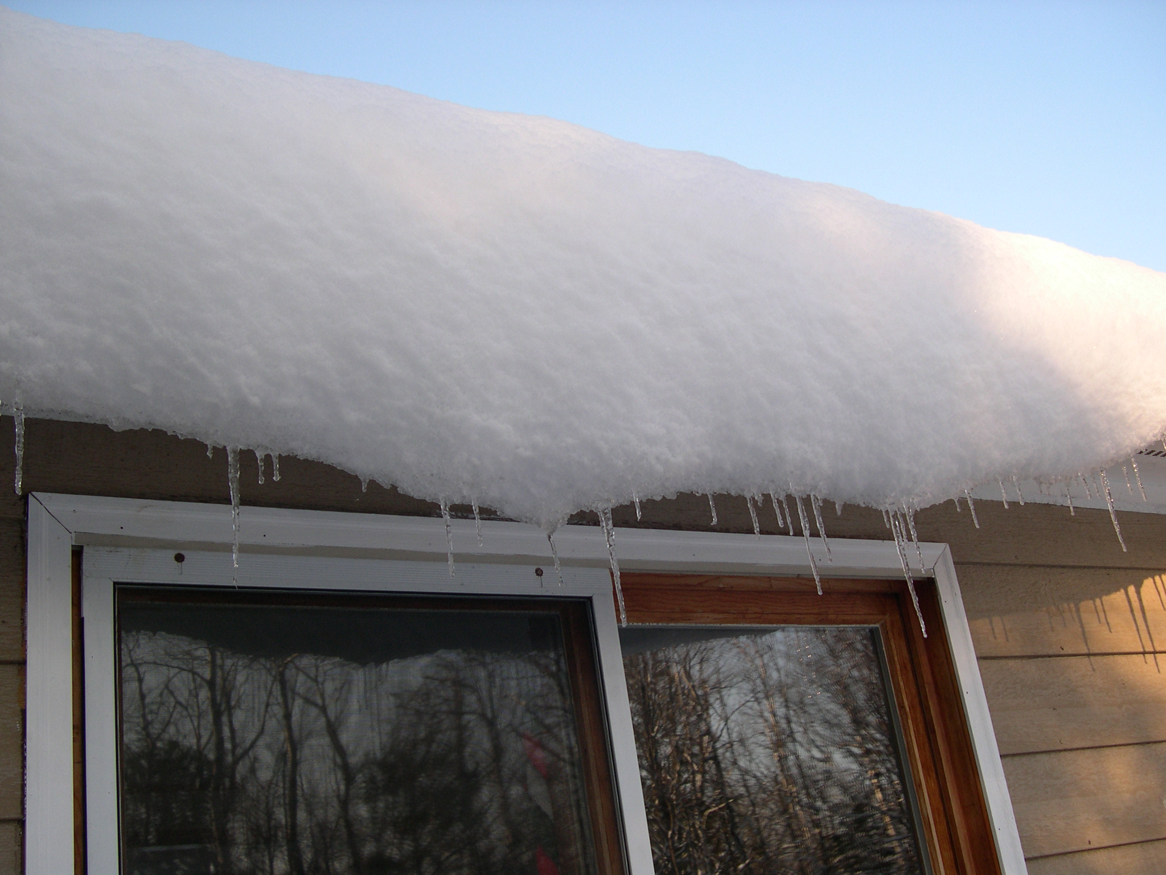When the snow builds up like this and then gets warm from the sun, ice forms under the snow. Eventually all that stuff on the roof lets go.