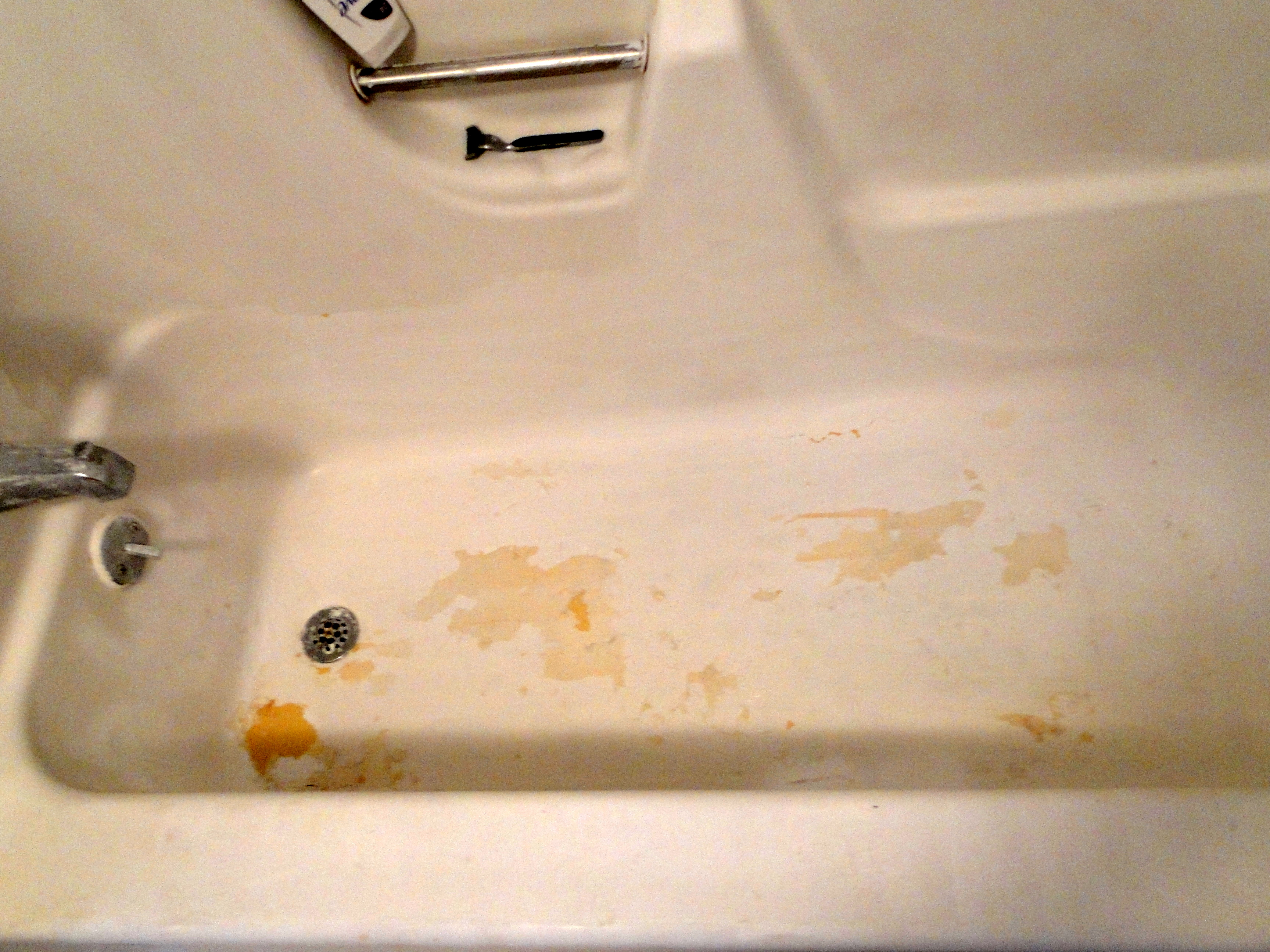 The house was built in the 1970’s and as I found out (and you can see here) the tub/shower had once been gold. In fact the guy who came out to give me an estimate for the refinishing said it looked like it had been refinished twice already.