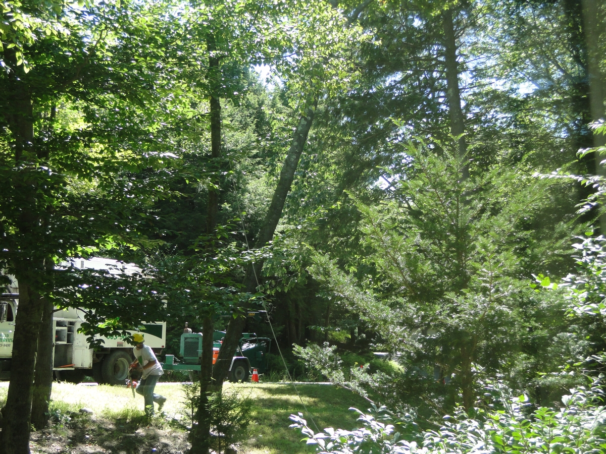When I moved into my house last year, I surveyed the tree line along the front yard. Those trees are very close to the house and fortunately they all looked like they were in good shape, except for the one on the end. It was July, and that tree had no leaves. I also noticed that the big one, in the cluster of three, had a big gouge in the trunk that looked like it had been there for many years.