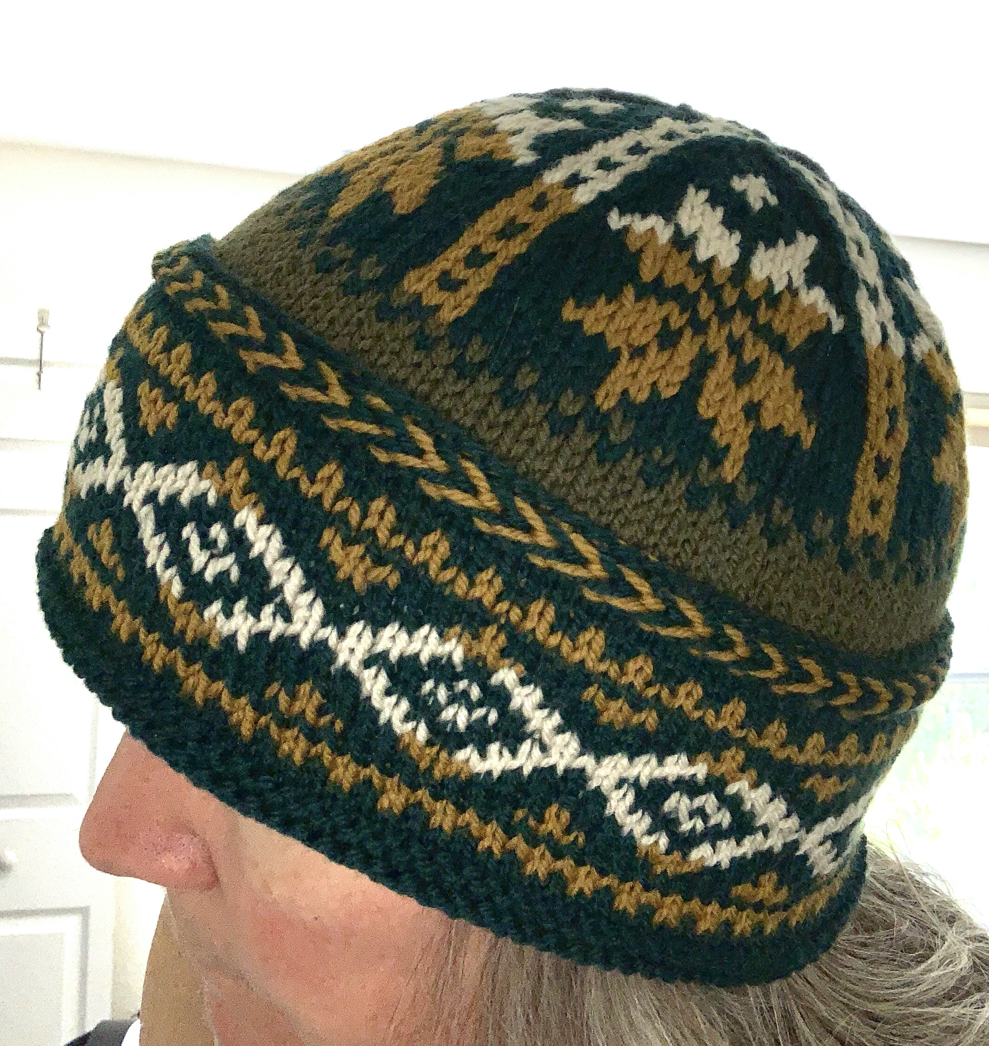 My newest Triple-patterned Watchcap fits my head – yay! It is snug, and I could probably wear the XL size. This one is a large and measures 20 inches around. A hat knit like this does not have much “give” because of the colorwork designs.