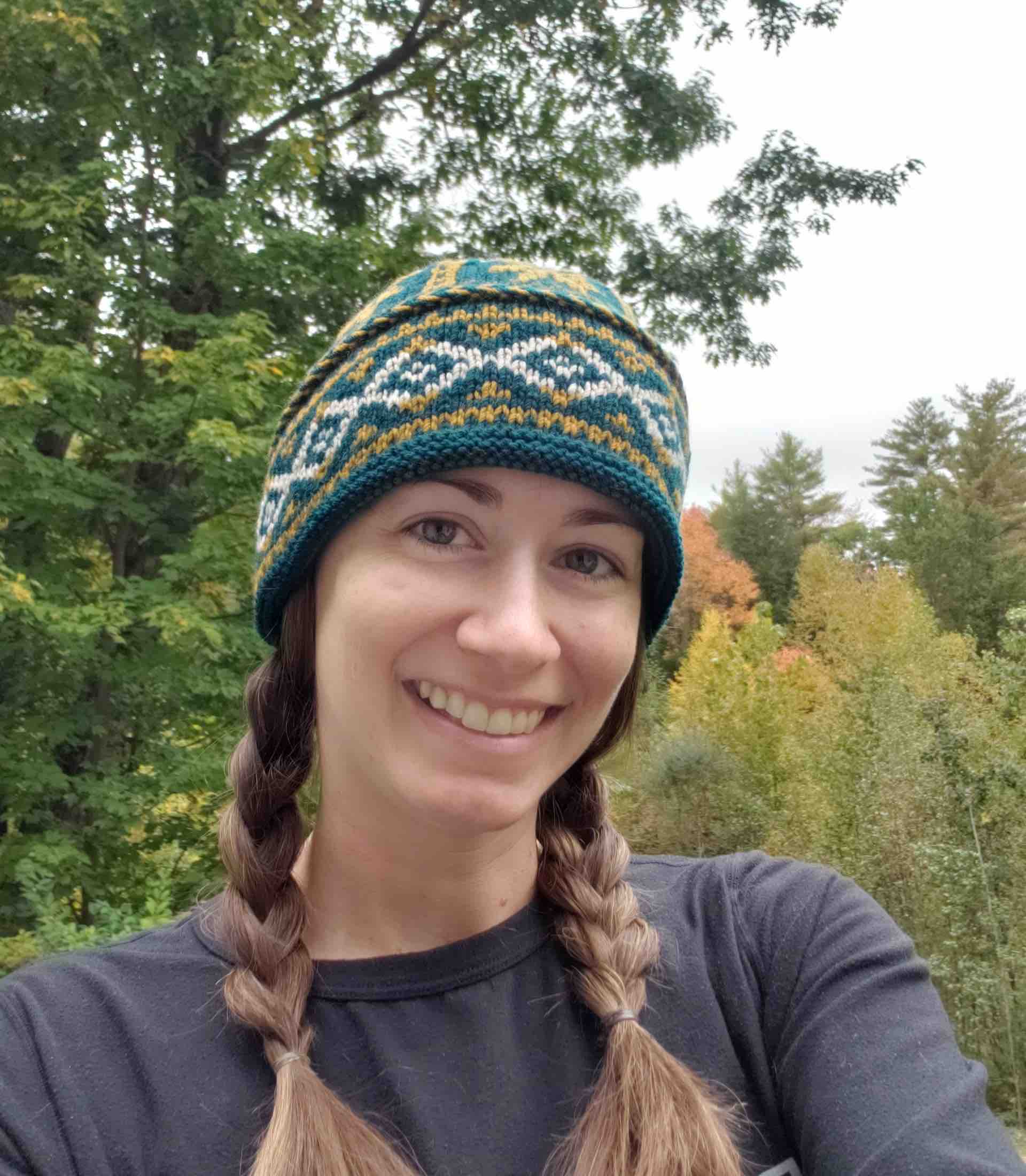 The pattern begins with a braid, then the first section of colorwork is knit. The work is turned, and the rest of the hat is knit.