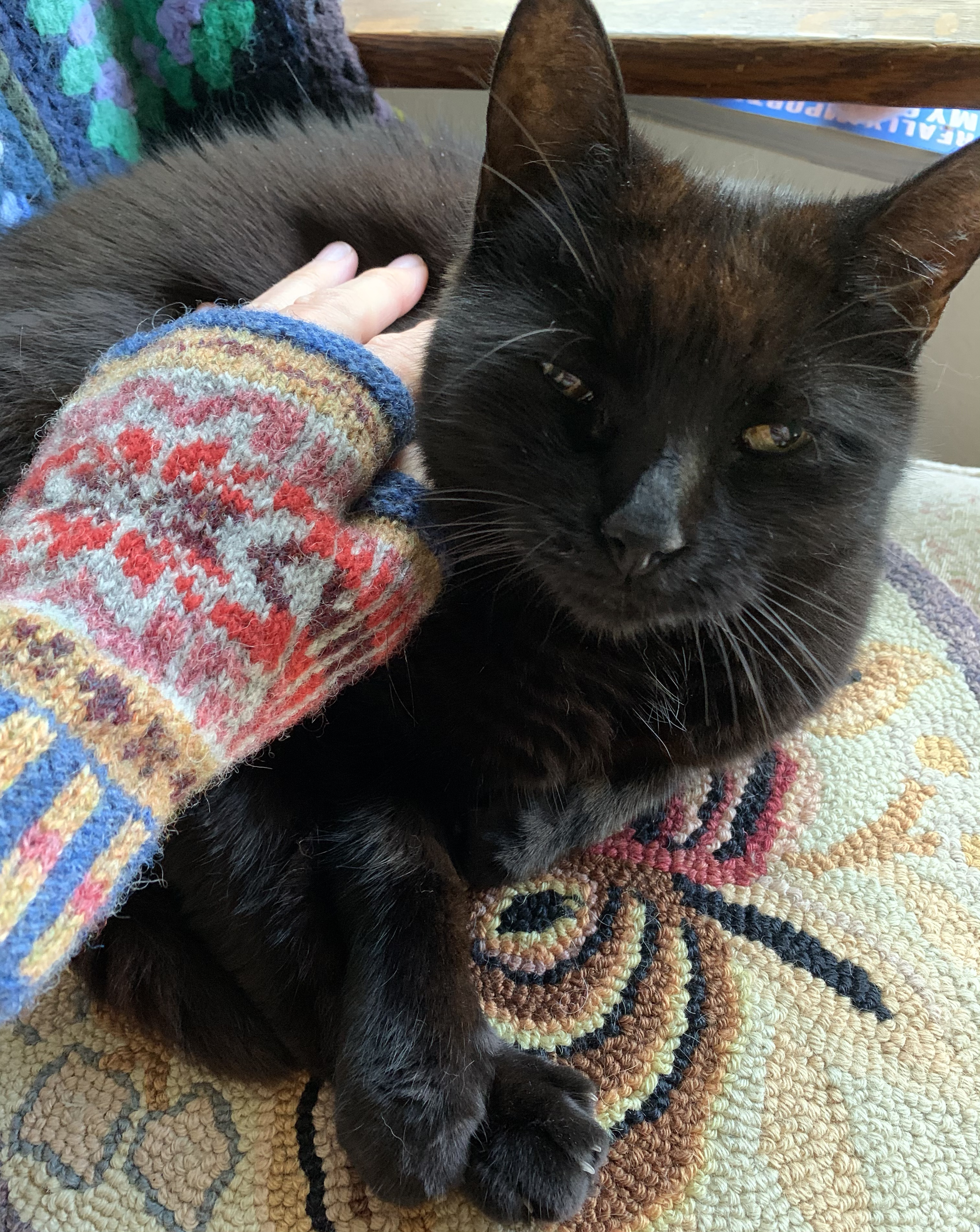 I just began the Cat mitts (which turned out huge, but will give me gauge) with a size 2 needle (same yarn) and got 33 stitches across 4 inches. So I will knit the mitt using a size 2 needle. I have circular 9 inch and DPN’s in size 2. I am no good at casting onto DPNs, and small circular needles are my preferred go to.