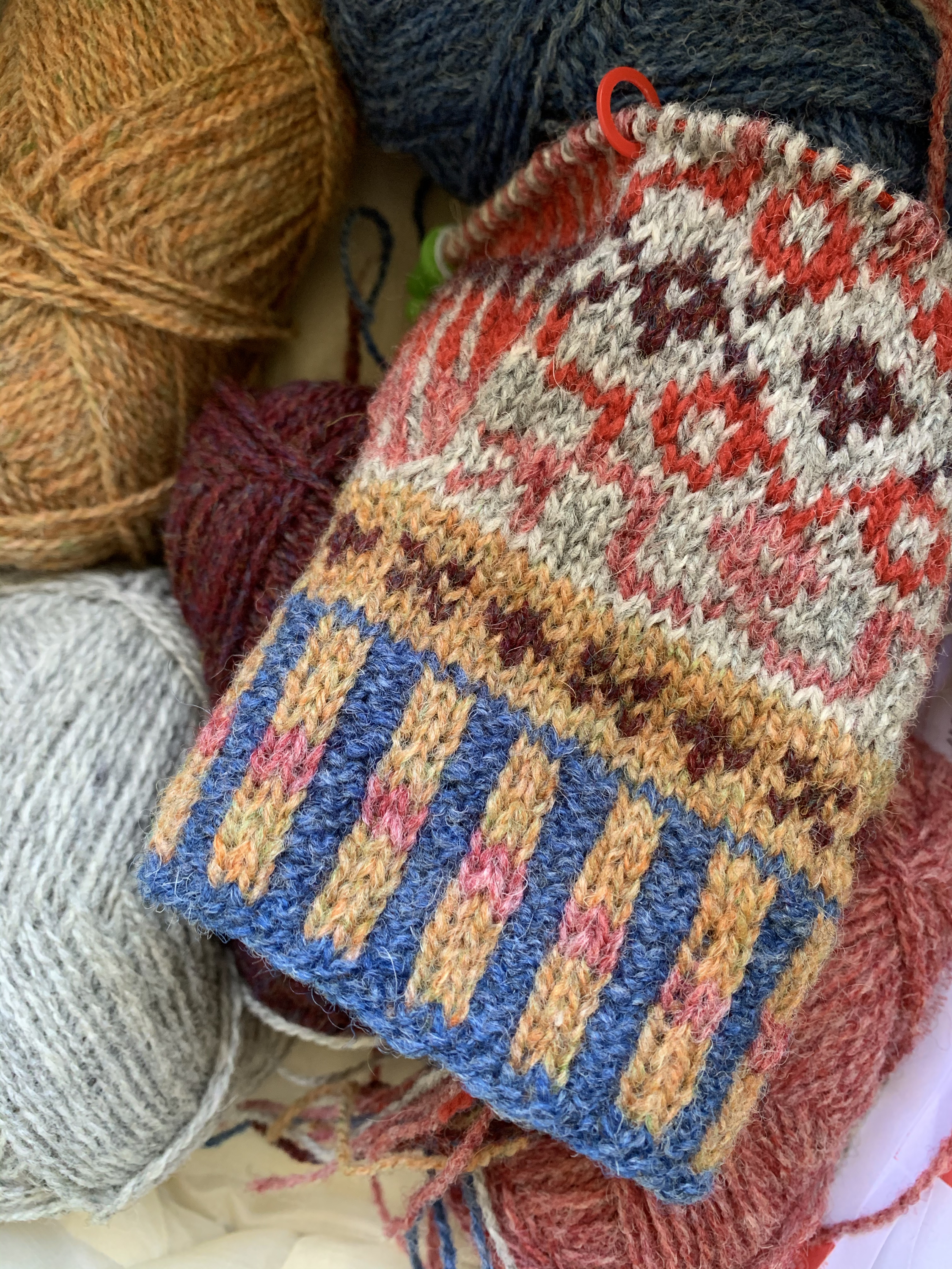 This page contains notes on knitting figerless mitts using stranded colorwork. I will be using Jamieson & Smith wool in five colors (added one, so six).