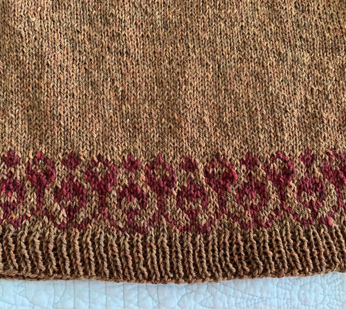 Colorwork in red yarn (Brooklyn Tweed Shelter – color “Long Johns”) was added along the bottom of the body. I went up to a size 8 needle for that. Then, I did the ribbing in size 7, but I wish I had used a 6. I may go back and redo that ribbing. (I did.)