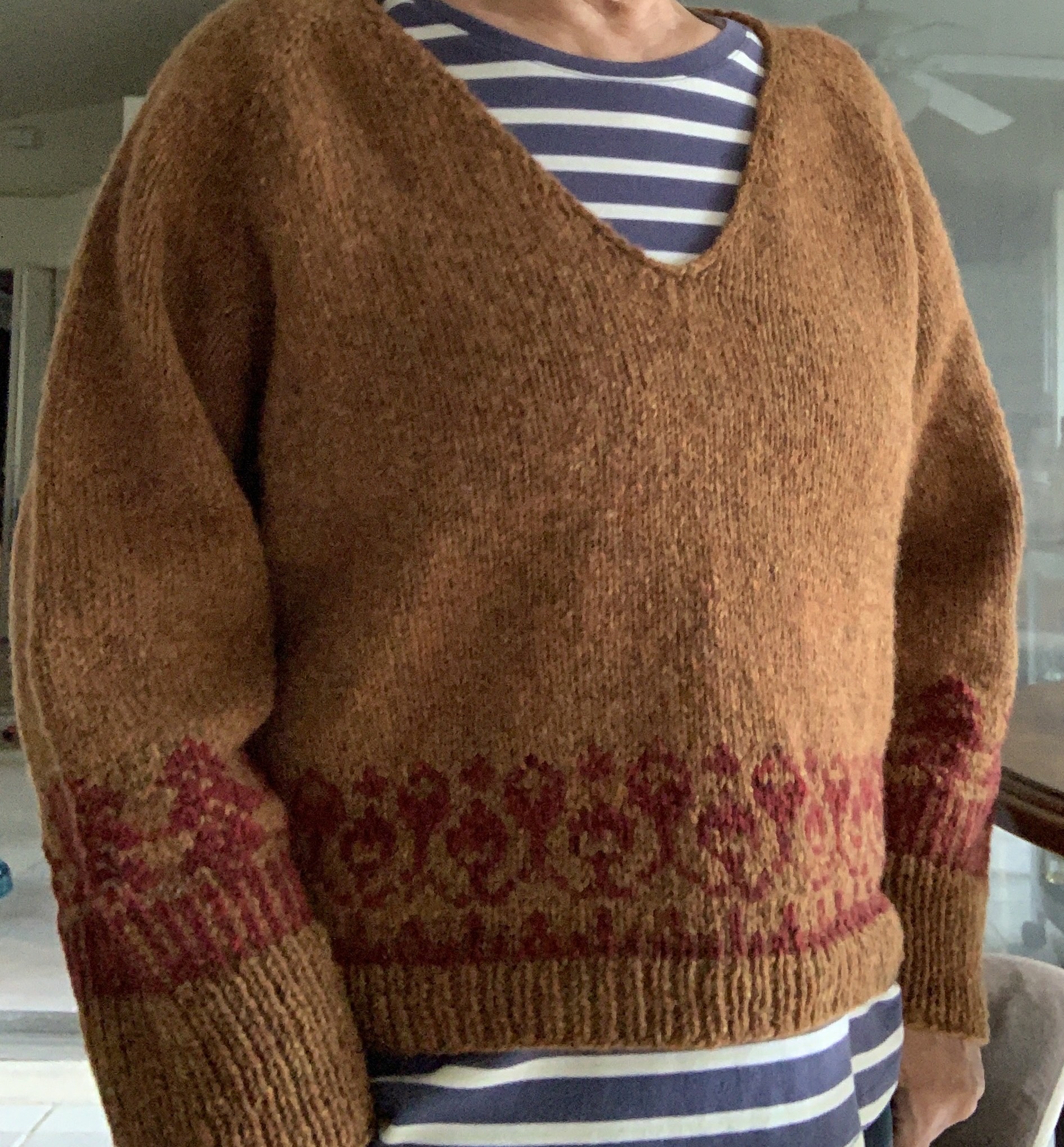 The reason I chose the Cumulus Blouse was the v-neck construction. I thought I would use a heavy yarn instead of the designer’s choice, but the pattern really wasn’t written for wool. I ended up with something a little different.