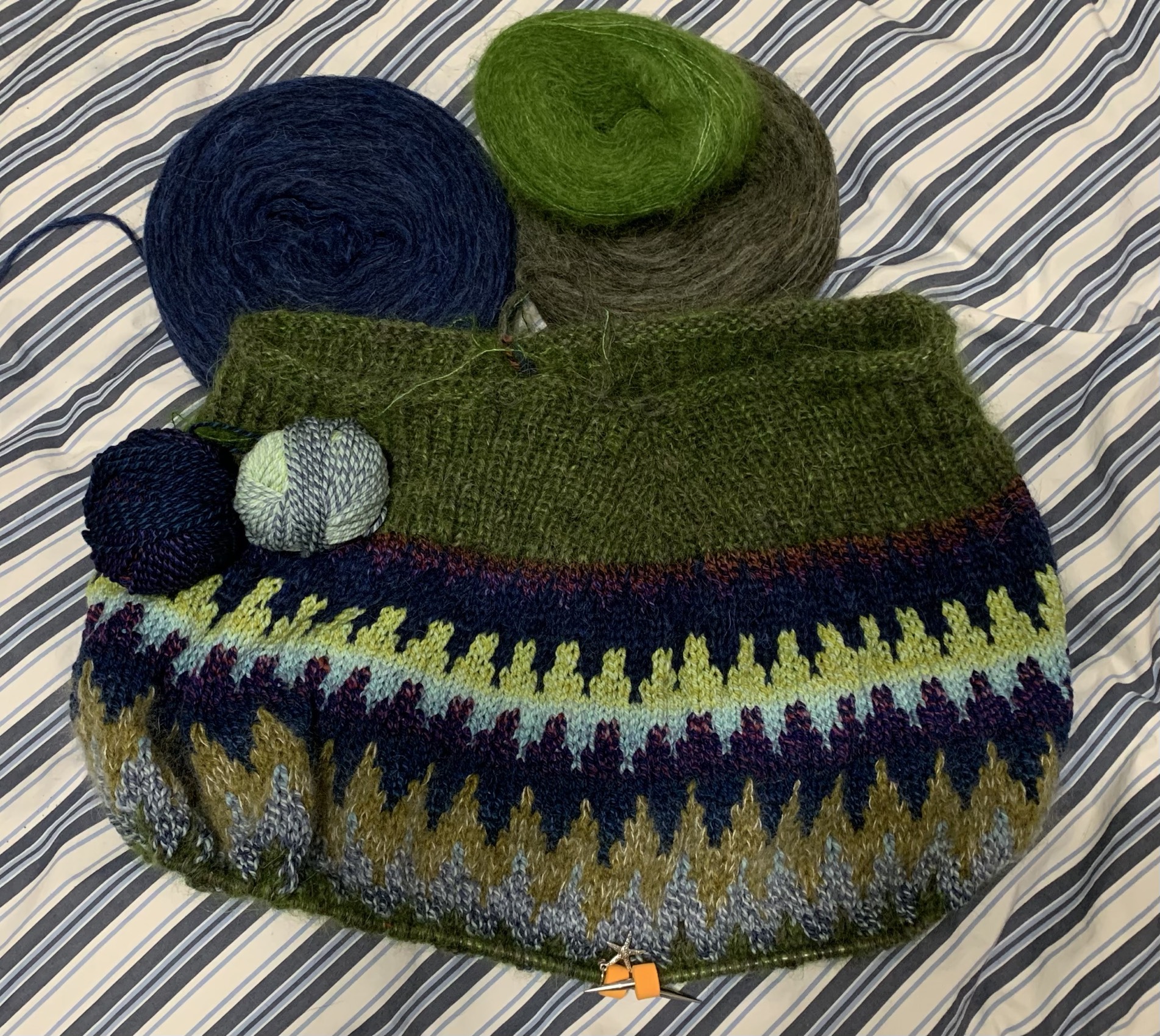My second Easy V is knit with Plotulopi and mohair held together. The colorwork yoke contains some variegated lime green-blue, dark blue plotulopi and other yarns I am using up.