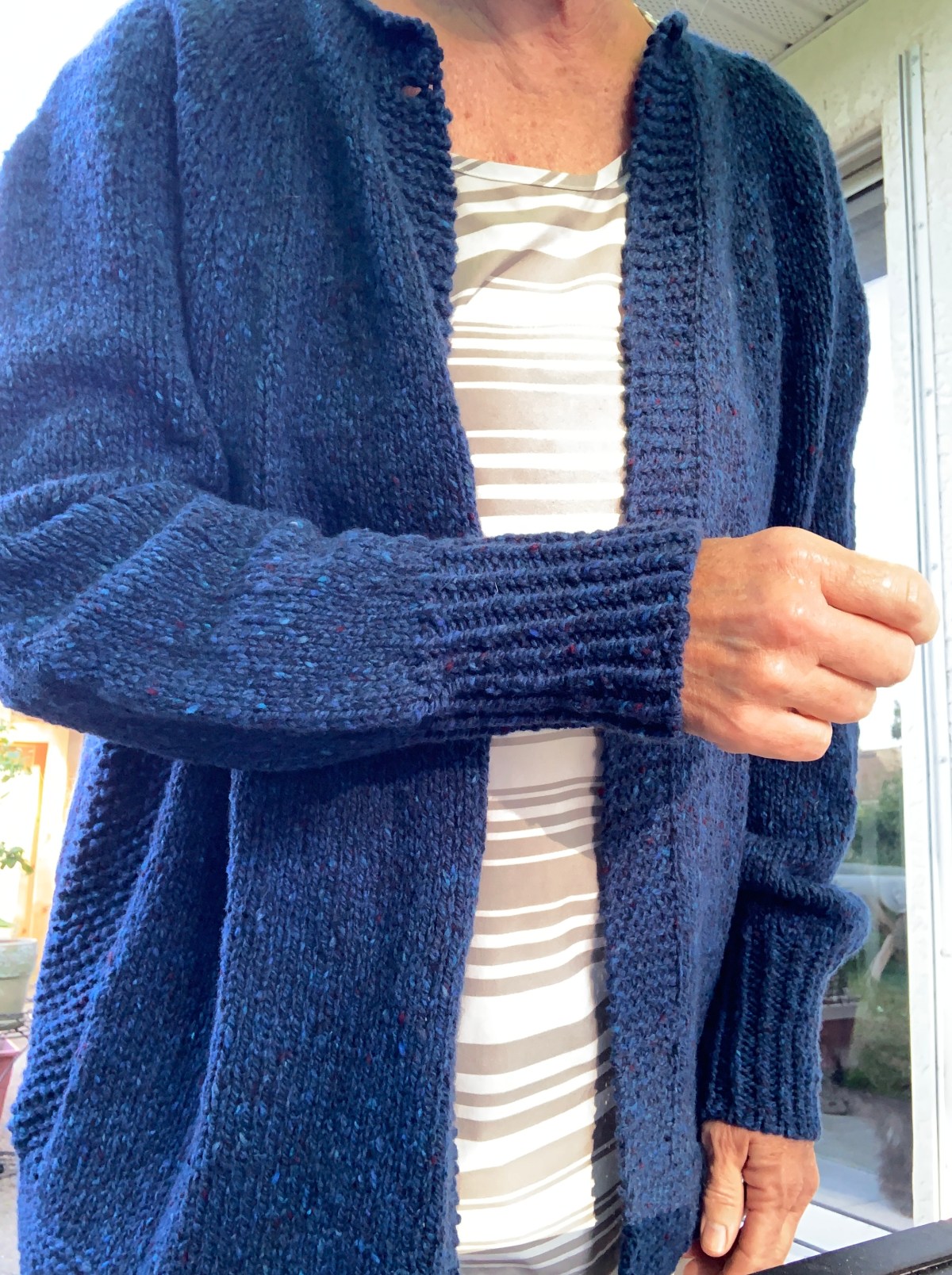 In the end, I’m quite happy with my new blue sweater. I got some quick photos of me wearing it, but it was a very hot and muggy May morning. I knit this one in size 2 and it is still plenty big. Keep this in mind if you knit this pattern – it runs quite large.