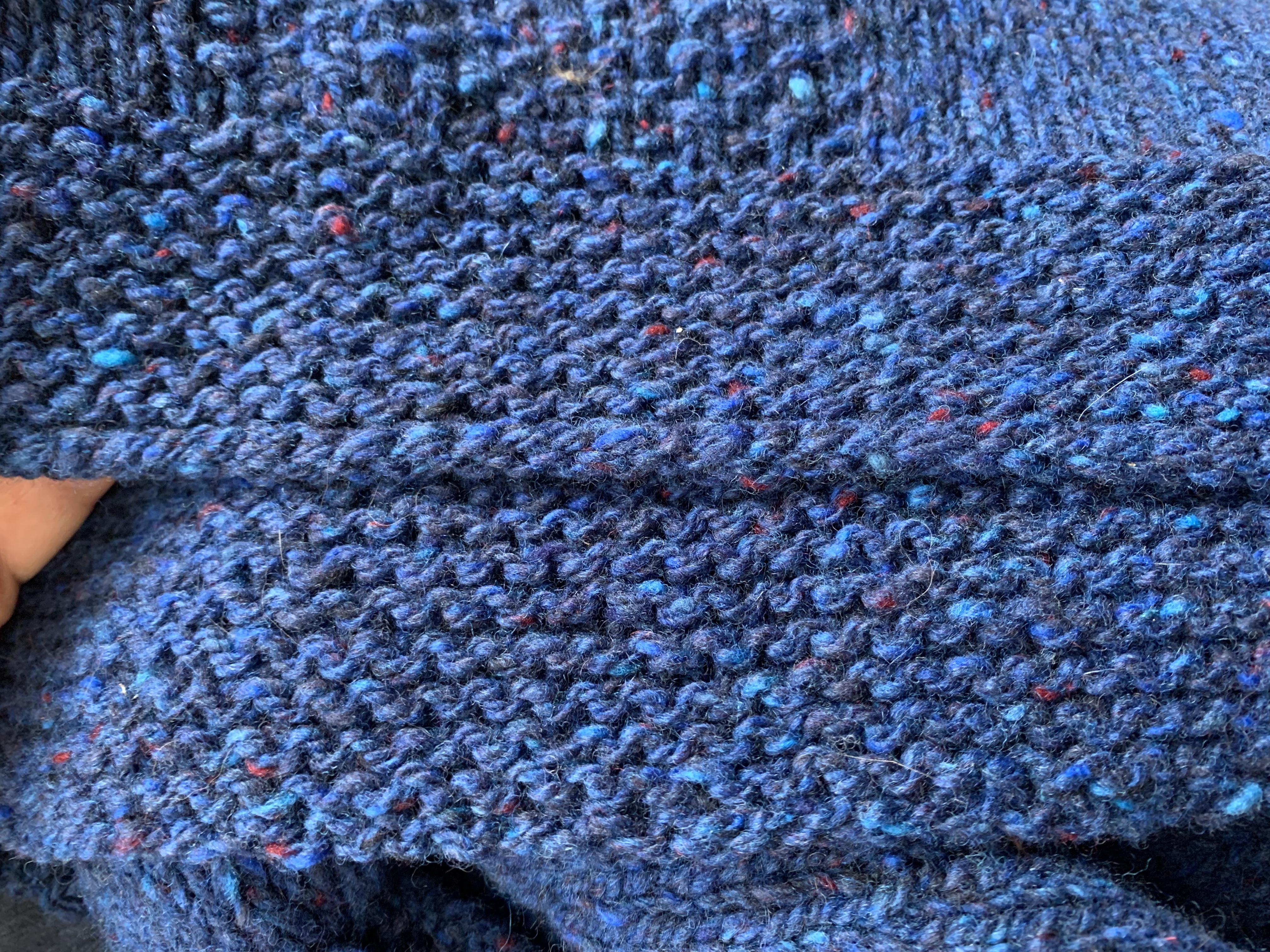 Along the sides of the sweater the pattern calls for garter sections. I decided to do seed stitch instead. The bottom is still done in garter rib, but I tried a new bind-off this time.