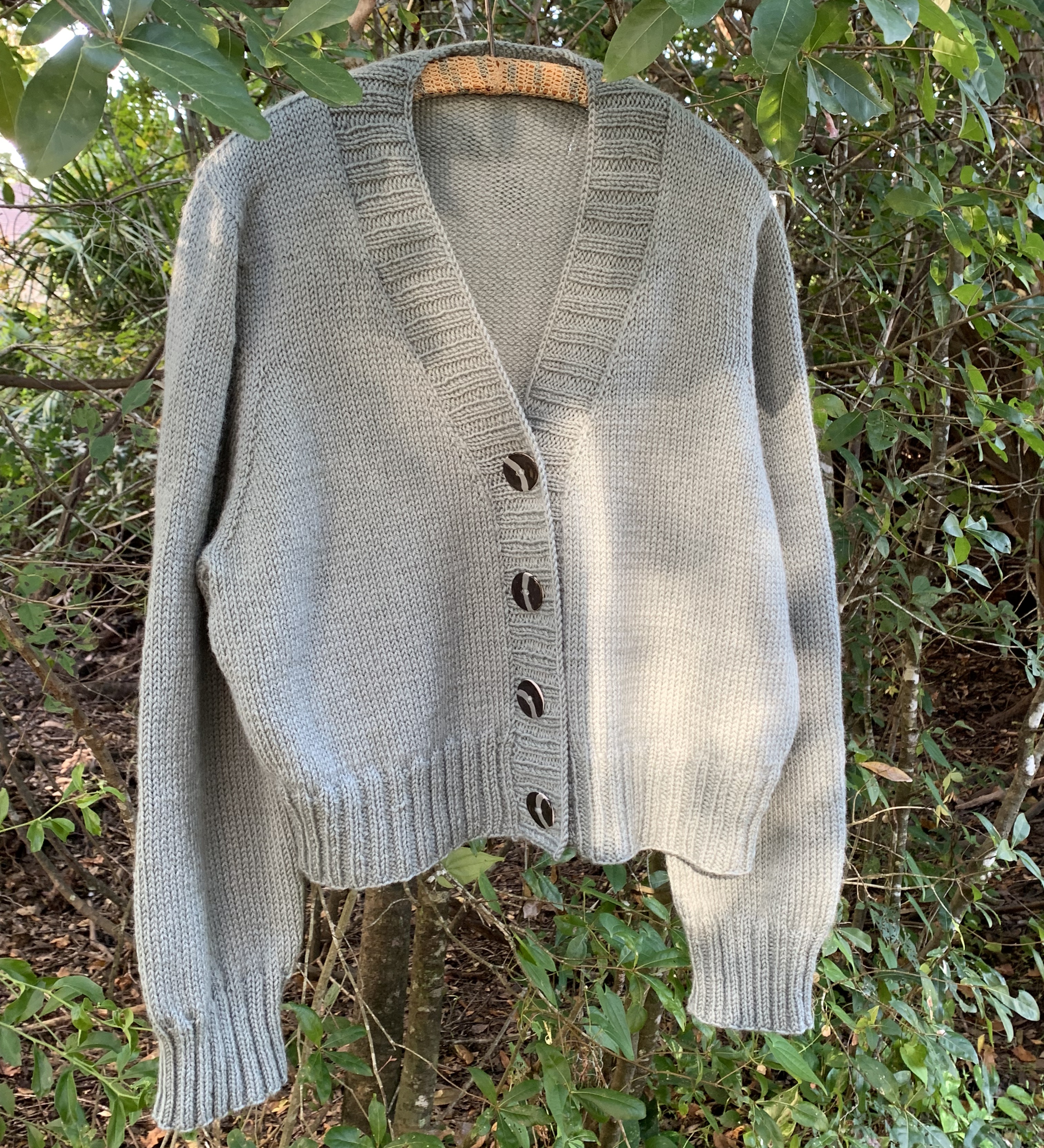 - October – *Eva Cardigan, by Petite Knit is an oversize sweater with a v-neck and wide button band. I had trouble getting gauge, but finished up nicely.