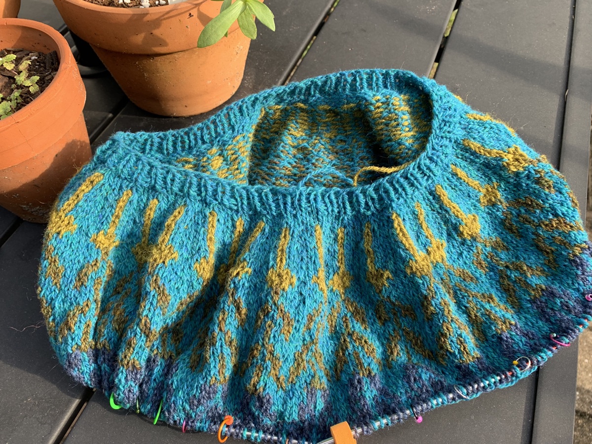 Now, I would only knit sweaters that do include short rows. In the Solvi pattern, short rows are incorporated after the colorwork section. This happens way down by the armpit area, which is odd. Short rows are usually made near the upper back area to lift the back of the neck.