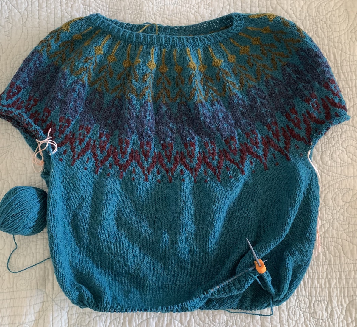 The Peacock blue yarn amounts to a little less than 1300 yards, which is not enough for my size. But we’ll see. I’m now knitting the body ribbing and have two full skeins of yarn left. I’m thinking that one for each sleeve should be plenty.