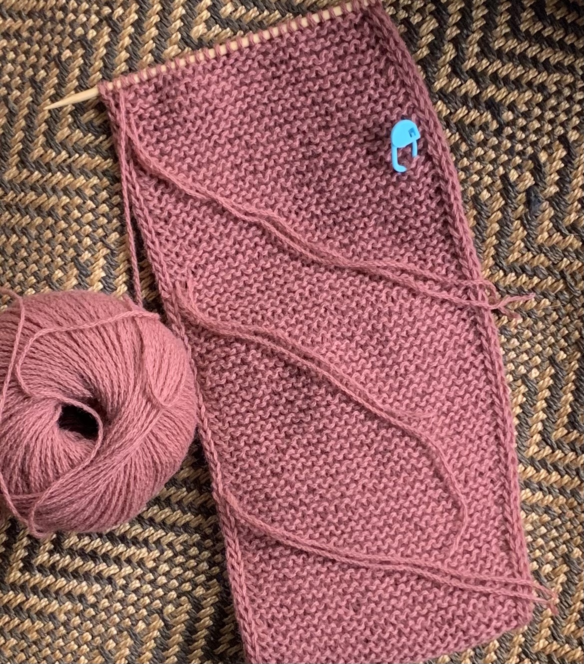 The designer has a suggestion for attaching a new strand, and that is to do so along the edge. I had planned to only have to attach a new ball – leaving 2 strands somewhere along the middle of the scarf. I now have 6 tails, and that is thanks to the faults in this ball of Cashmere yarn!