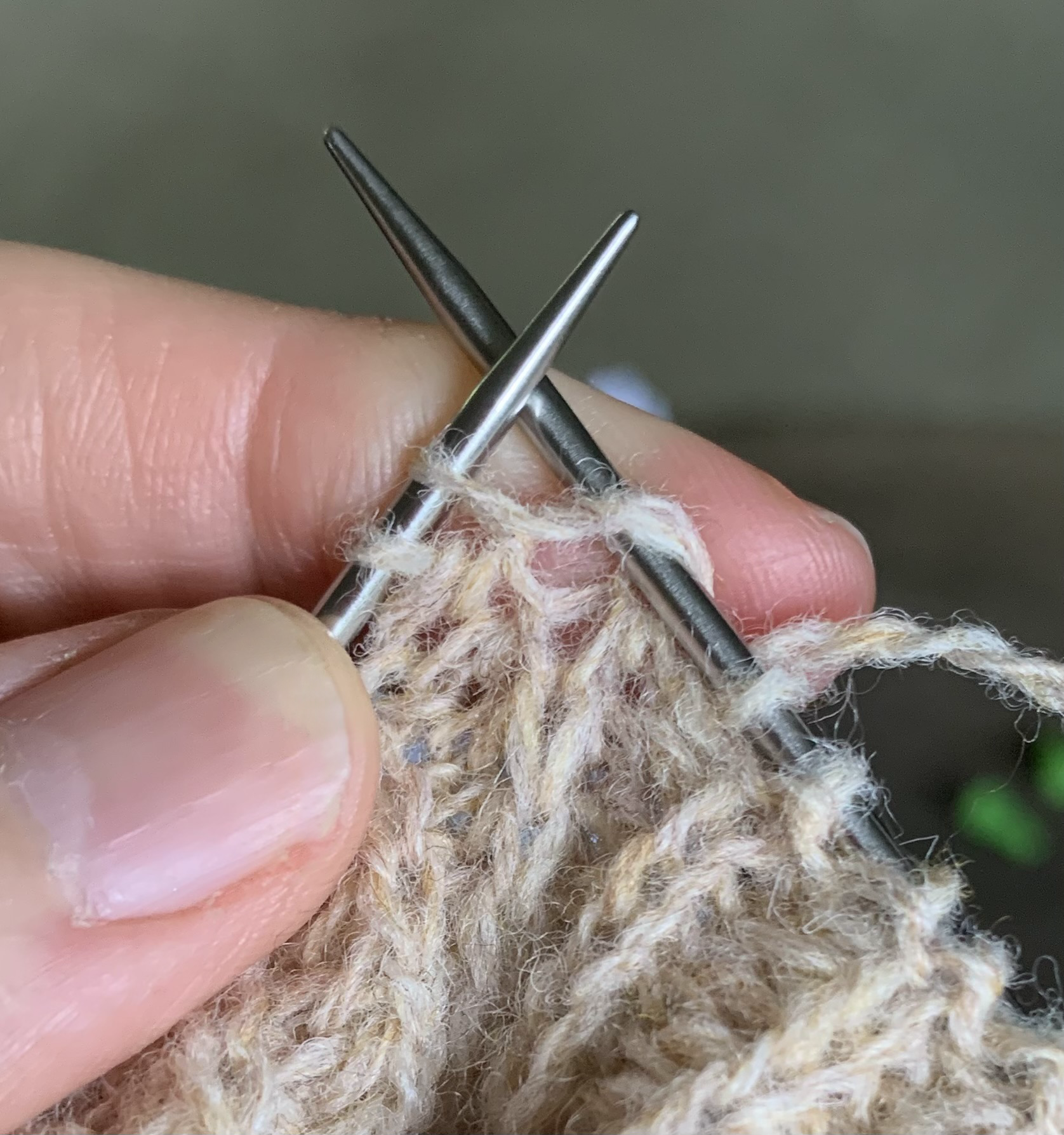 The whole pattern consists of alternating rows. First: one row of knit one below, and purl one. A “knit below” means I have to find the correct spot for the needle (see my photo below). I have to pull the yarn a bit to find the perfect place to make my knit stitch. After this row we do an entire purl row. Twice around completes one row. This makes for very slow going.