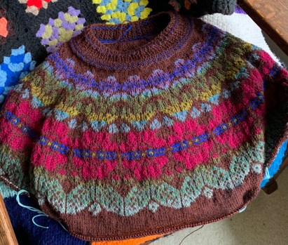 Previous Image Next Image Autumn Alpine yoke Yoke finished Done knitting the colorwork section of the yoke on the Autumn Alpine pullover sweater pattern. Share this:TweetShare on TumblrMoreLike Loading...