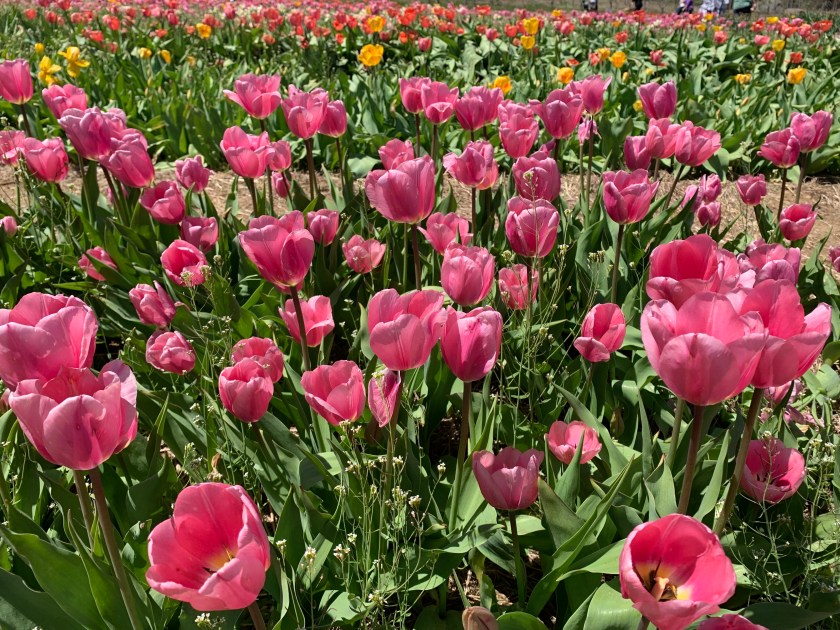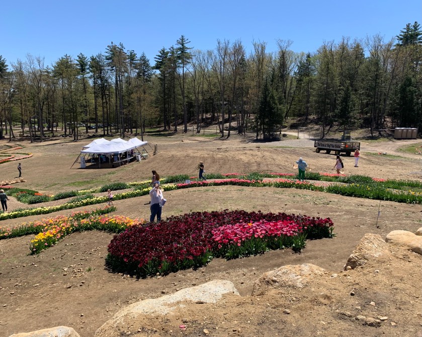In Hancock, a quaint little town in the southern part of the state, there is now a farm that grows tulips. We stopped to check it out on our way home from Harrisville. My daughter said that they ask you to make parking reservations at busy times. It was mid-week, and we figured, “How busy could it be?” Well, for a mid day, mid week visit, the field (parking lot) was full of cars, the road was full of people, and the tulip field was hopping! We were stunned at the turn out. Wolf Pine Hollow Farm at tulip time is apparently a big deal.