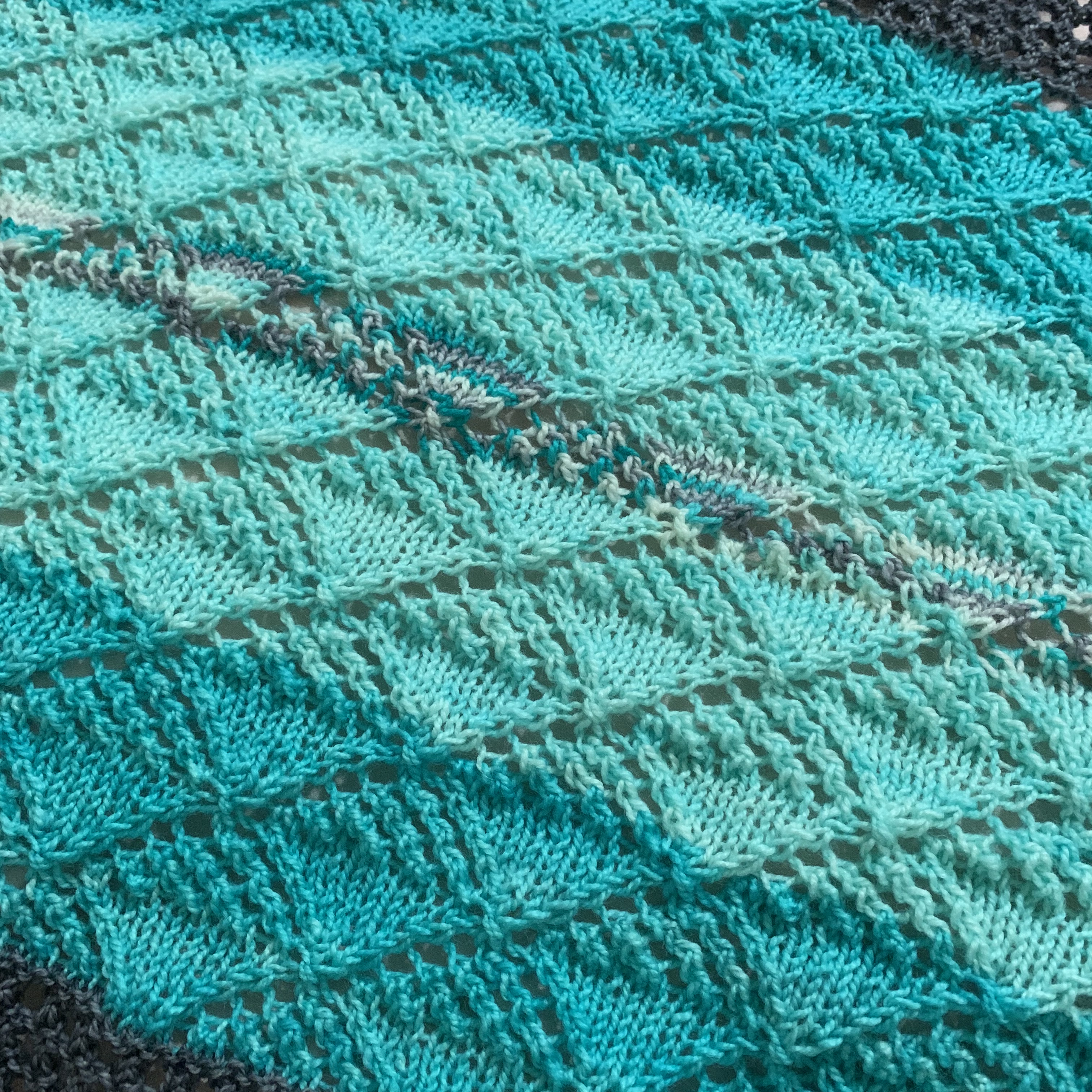 Previous Image Next Image Colors of the Quince Wrap Rows of aqua in my Quince Wrap knitted shawl. Close up of the finished Quince shawl by Ambah O’Brien. Share this:TweetShare on TumblrMoreLike Loading...