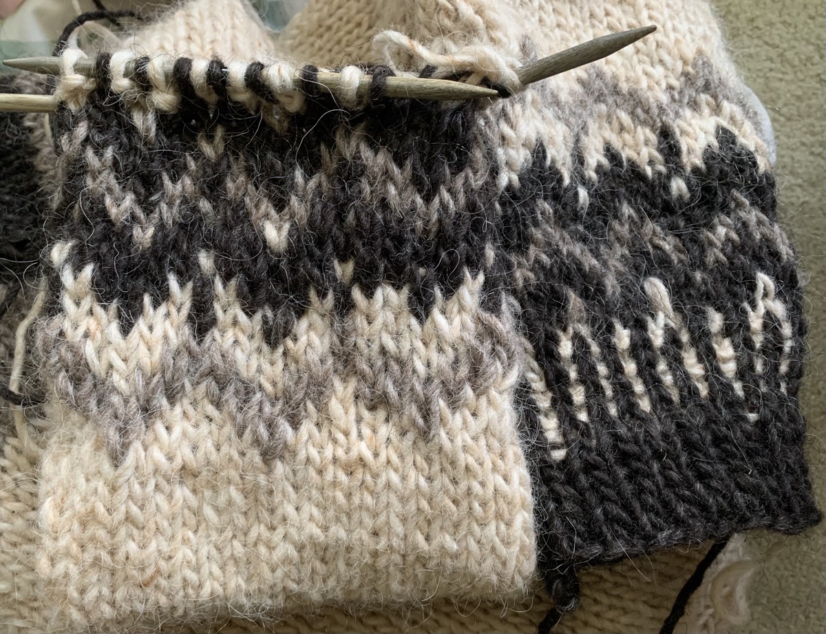 Previous Image Next Image knitting sleeve 2 Sleeve number two nearly knit in white, black and gray Alafosslopi wool. Share this:TweetShare on TumblrMoreLike Loading...