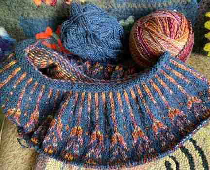 Two color knitting the yoke of the sweater pattern “Meadow Moon” using jean blue J&S wool and hand-spun ball of variegated brown.