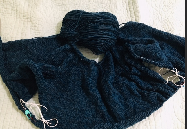Previous Image Next Image Fine Sand sweater knitting yoke The yoke area with armholes placed on white waste yarn Fine Sand sweater knitting with armholes placed on hold to knit down the length of the sweater Share this:TweetShare on TumblrMoreLike Loading...