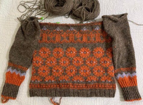 Previous Image Next Image sweater Sleeves nearly done so the parts can be joined Sweater knitting in orange Lettlopi and green Plotulopi yarn with floral colorwork pattern. Share this:TweetShare on TumblrMoreLike Loading...