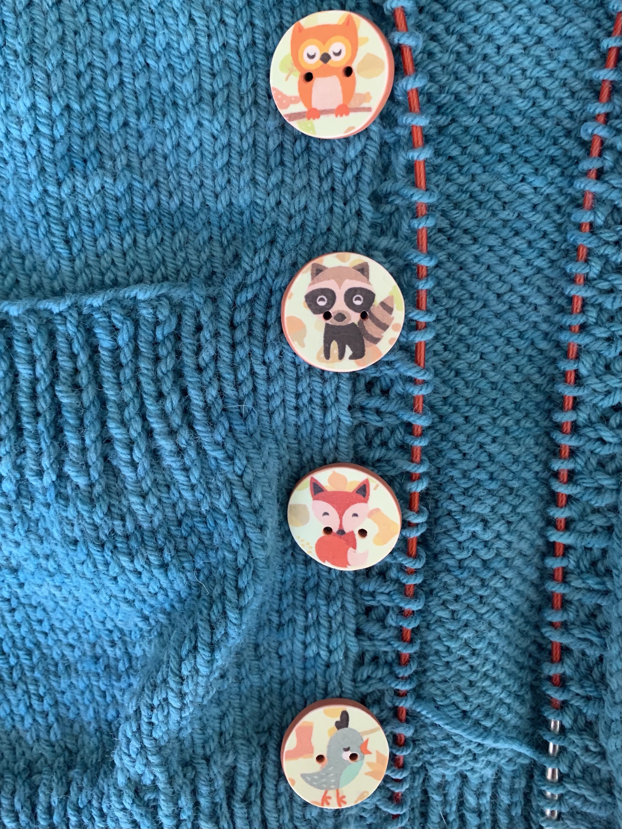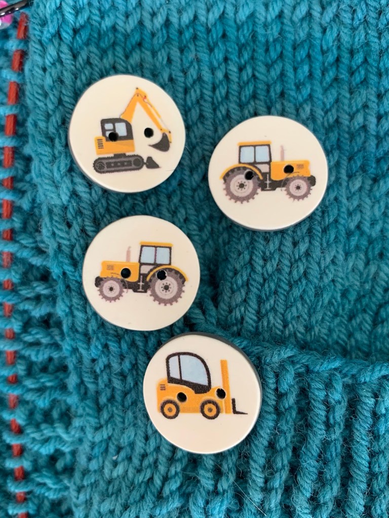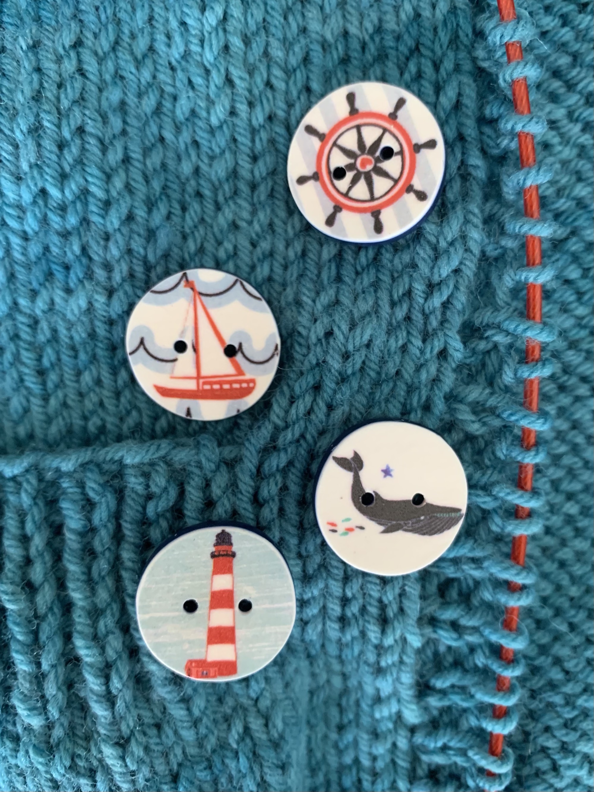 Because of the small sweater size, I plan to do only four buttons. My choices are nautical designs, little tractors, or cute animals. I’m leaning toward the animals.