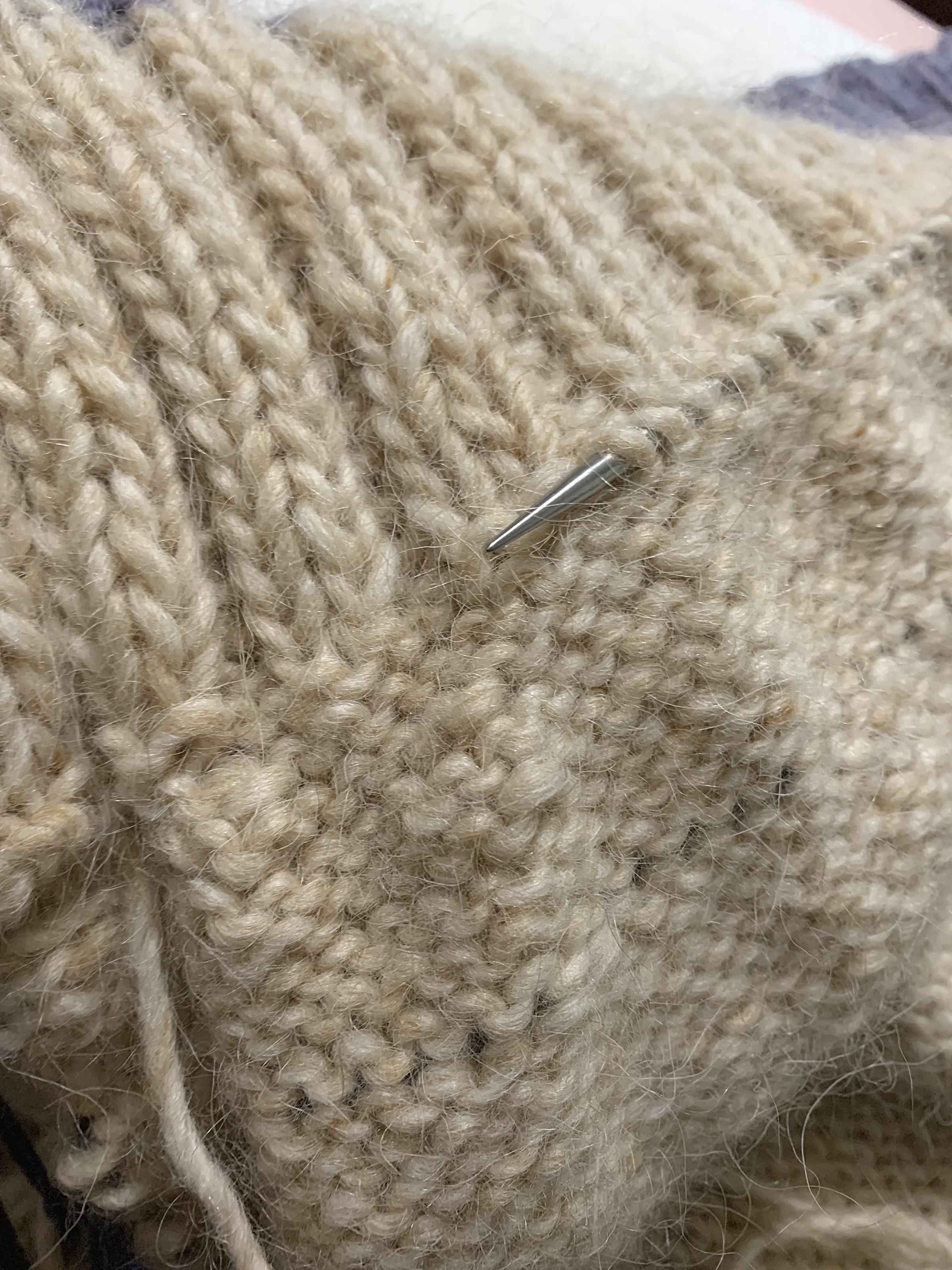 Because I was worried about yarn amount, I put body stitches on hold at 8 inches to knit the sleeves. I knit the first sleeve on a 16” circular to begin, then changed to DPNs. It was difficult. The yarn is slippery and keeping the stitches on the needles was a pain. On the second sleeve, I used a 16” circular for the entire sleeve after dropping stitches when one of the DPNs slipped right out of the stitches! I was not having fun. (I knit with Lykke wood DPNs, but switched to the same brand 16”.)