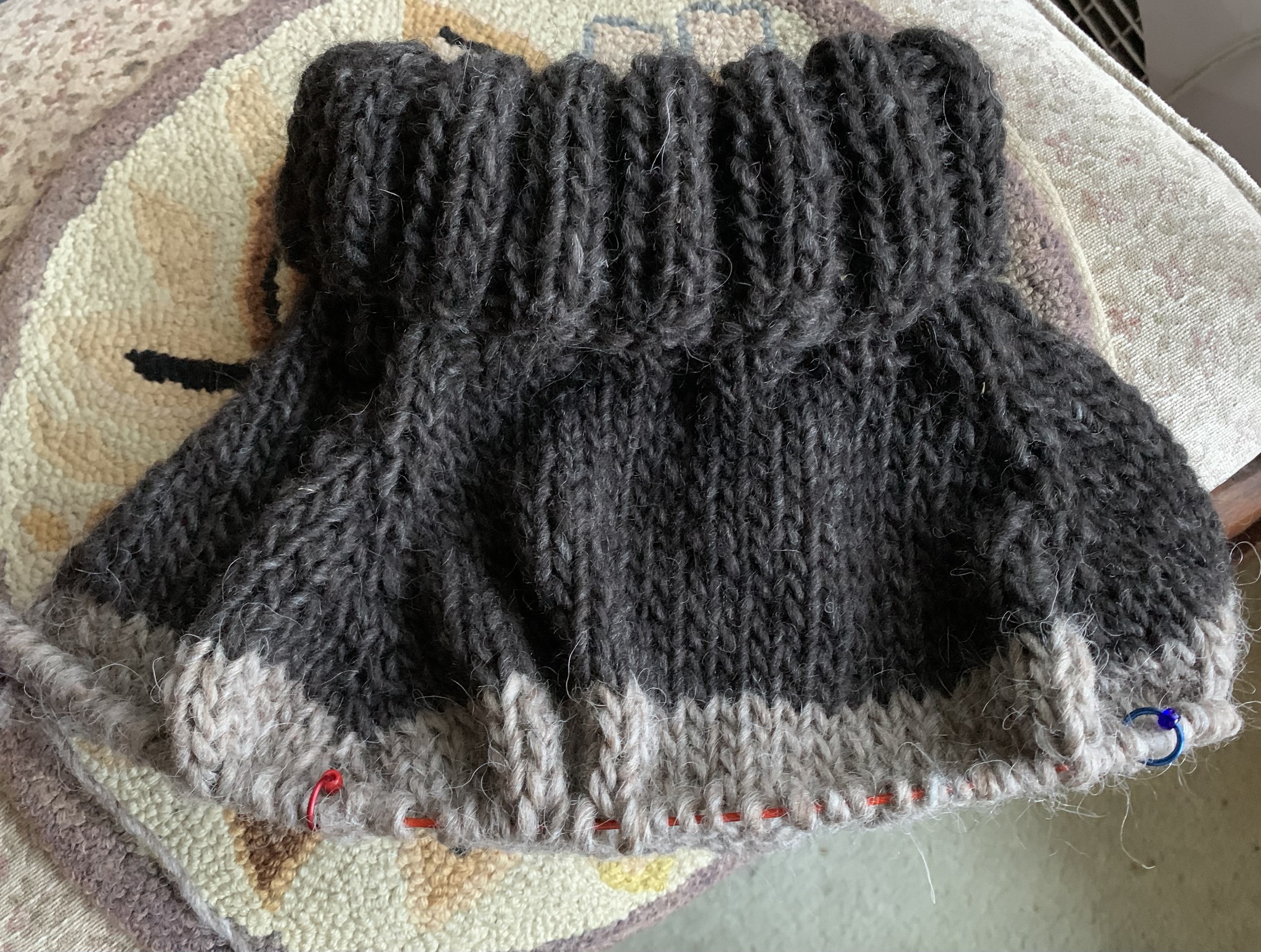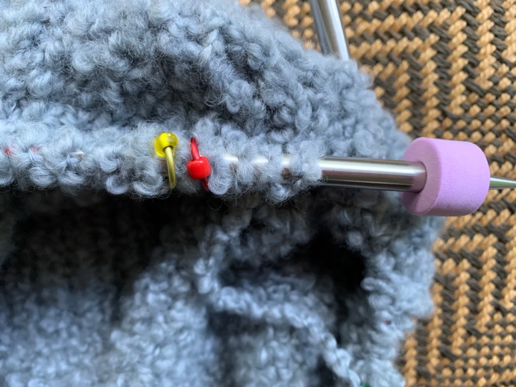 Simply knitting around and around isn’t bad. When it came to the 1×1 ribbing, forget it. I had no idea which was a knit and which was a purl if I lost my place. I ended up placing markers every 10 stitches or so (an even number) knowing that I would begin after each marker with a knit stitch. It was the only way to keep track of my knits and purls.