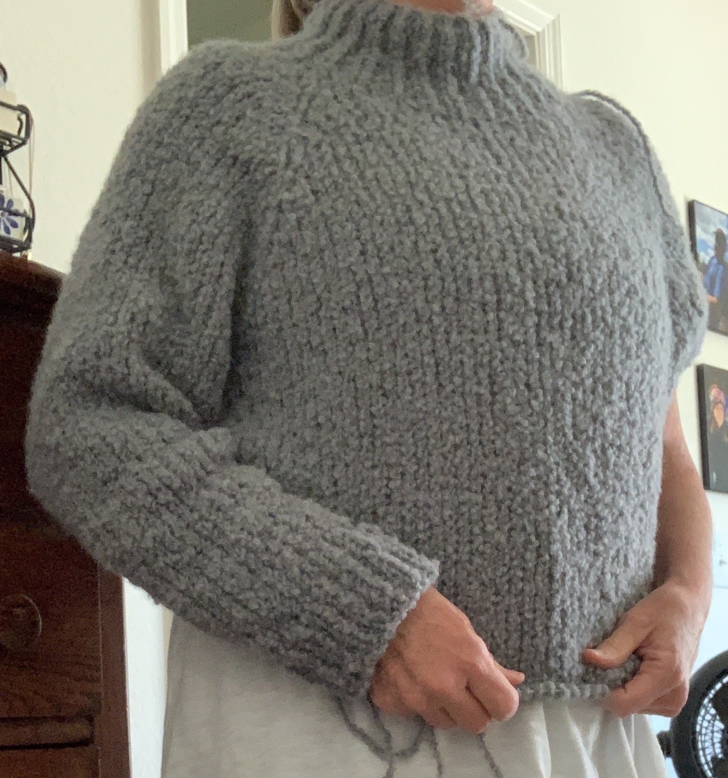 After finishing the sleeves I picked up the body stitches with the smaller size 10 needle and did the ribbing until the yarn was gone – with enough to bind off. I would have liked a little more length, but the yarn was gone.