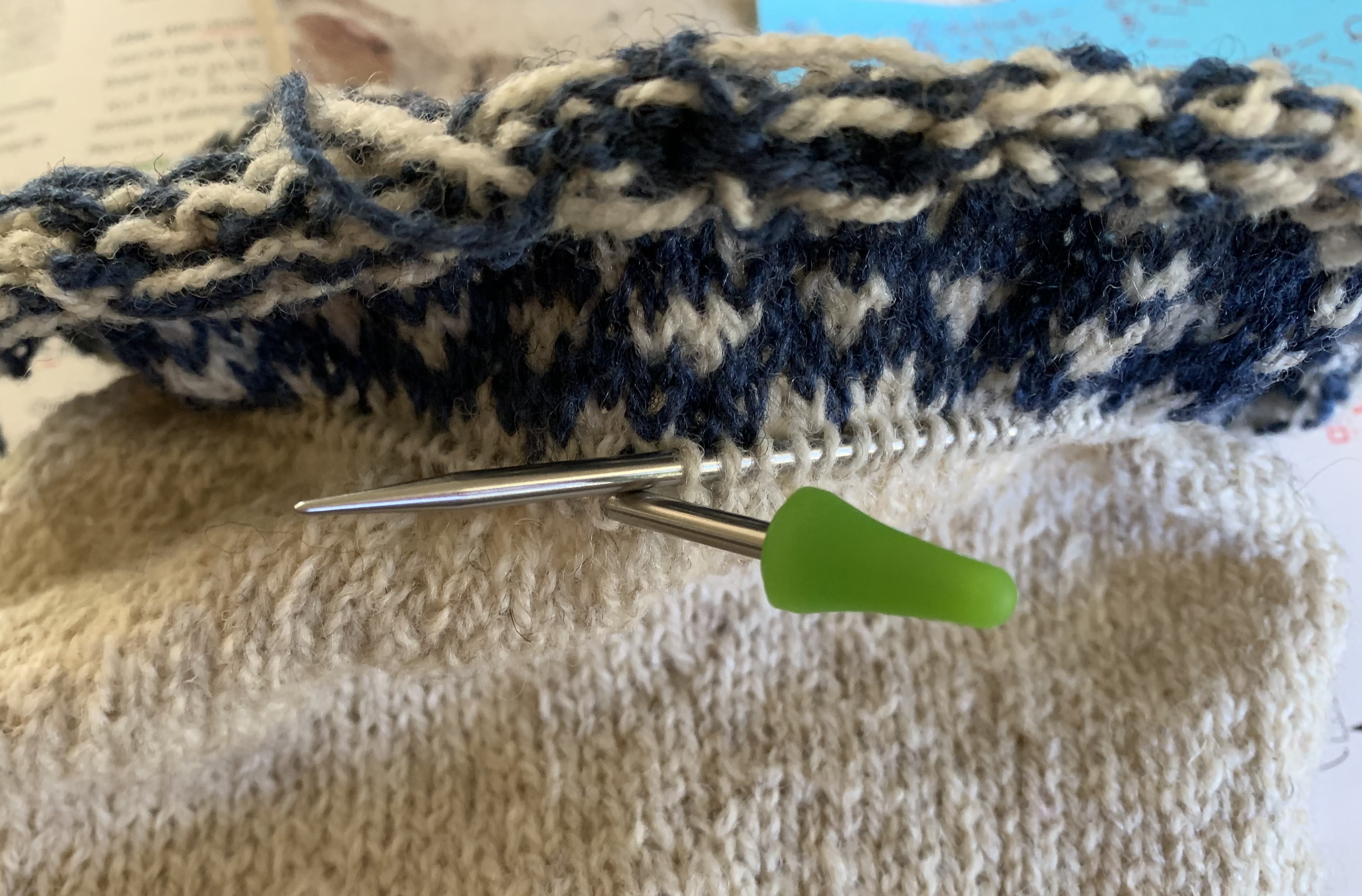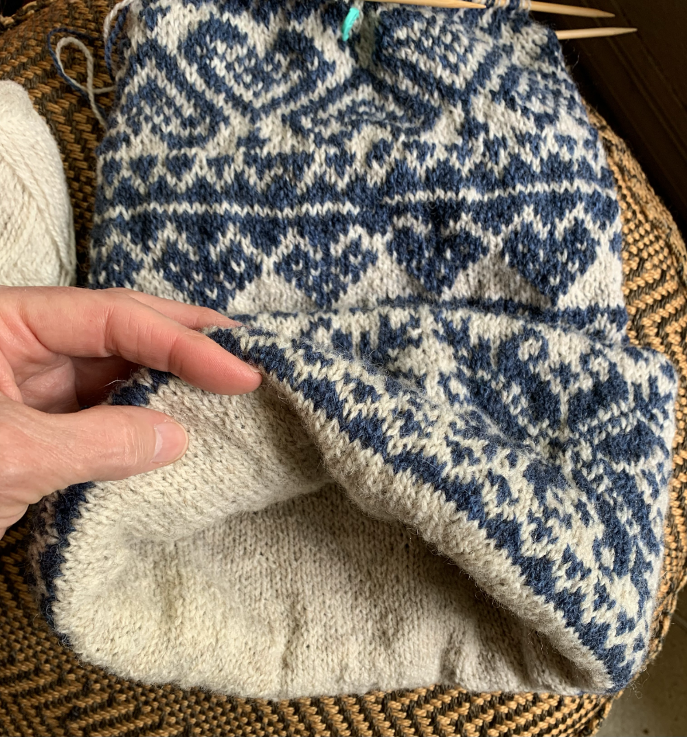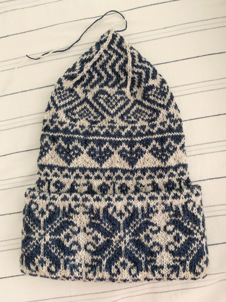 First a note on finishing up this knitting project. One key thing I want to mention is to be sure and weave in your ends BEFORE you make decreases at the crown. I spit spliced my wool, and only had two ends to weave, but I had to pull that section up through the crown opening.
