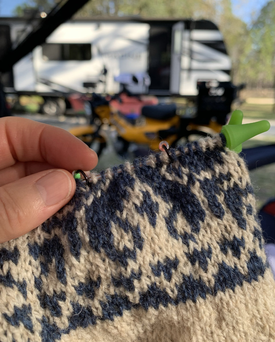 All my knitting photos are selfies. I prop the camera somewhere and use the 3, or 10 second delay. Usually I go outside, unless it’s too hot. Then I do a lot of cropping and fixing, … oh and deleting too!