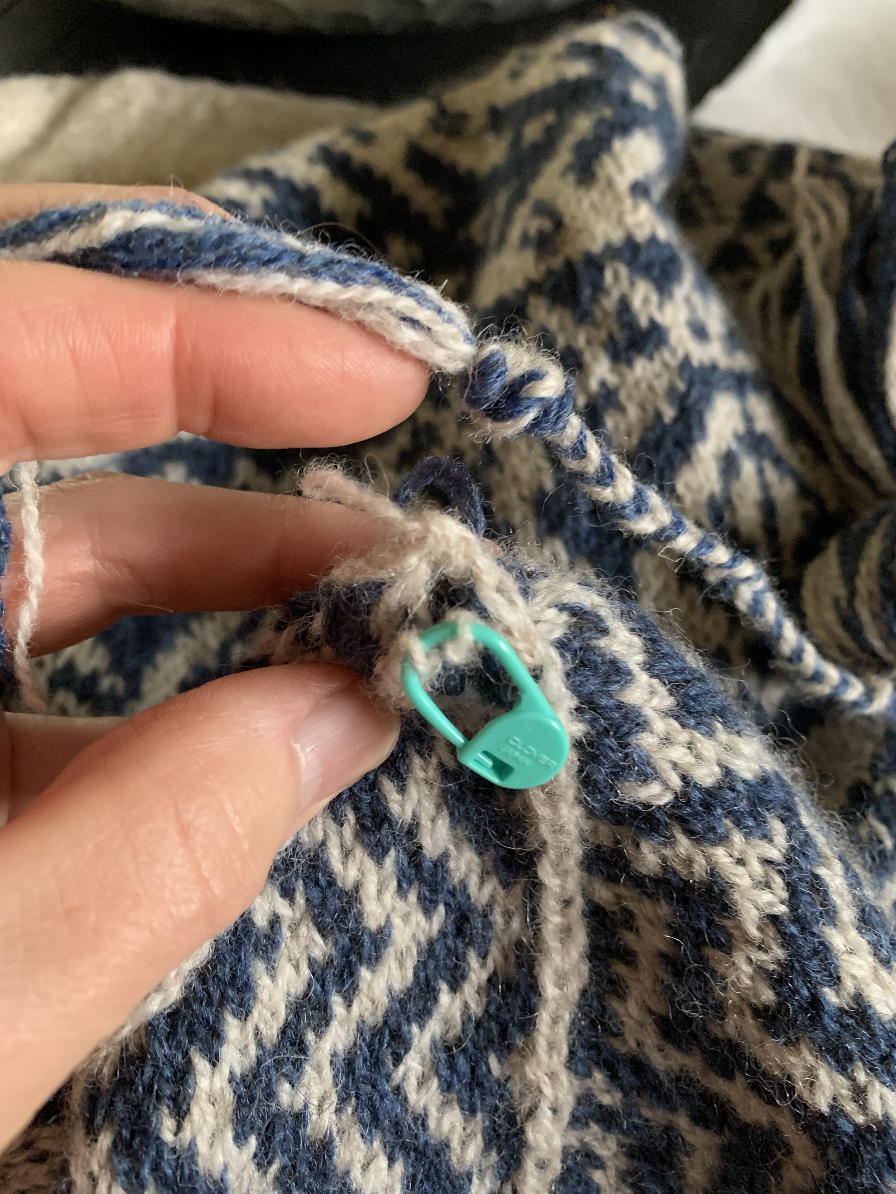 I’m using three skeins of Rauma Finull, which is a fingering weight, rustic wool. I dug into my stash and had enough of the natural beige heather to be the main color and lining. I’m using a dark blue as the contrast color.