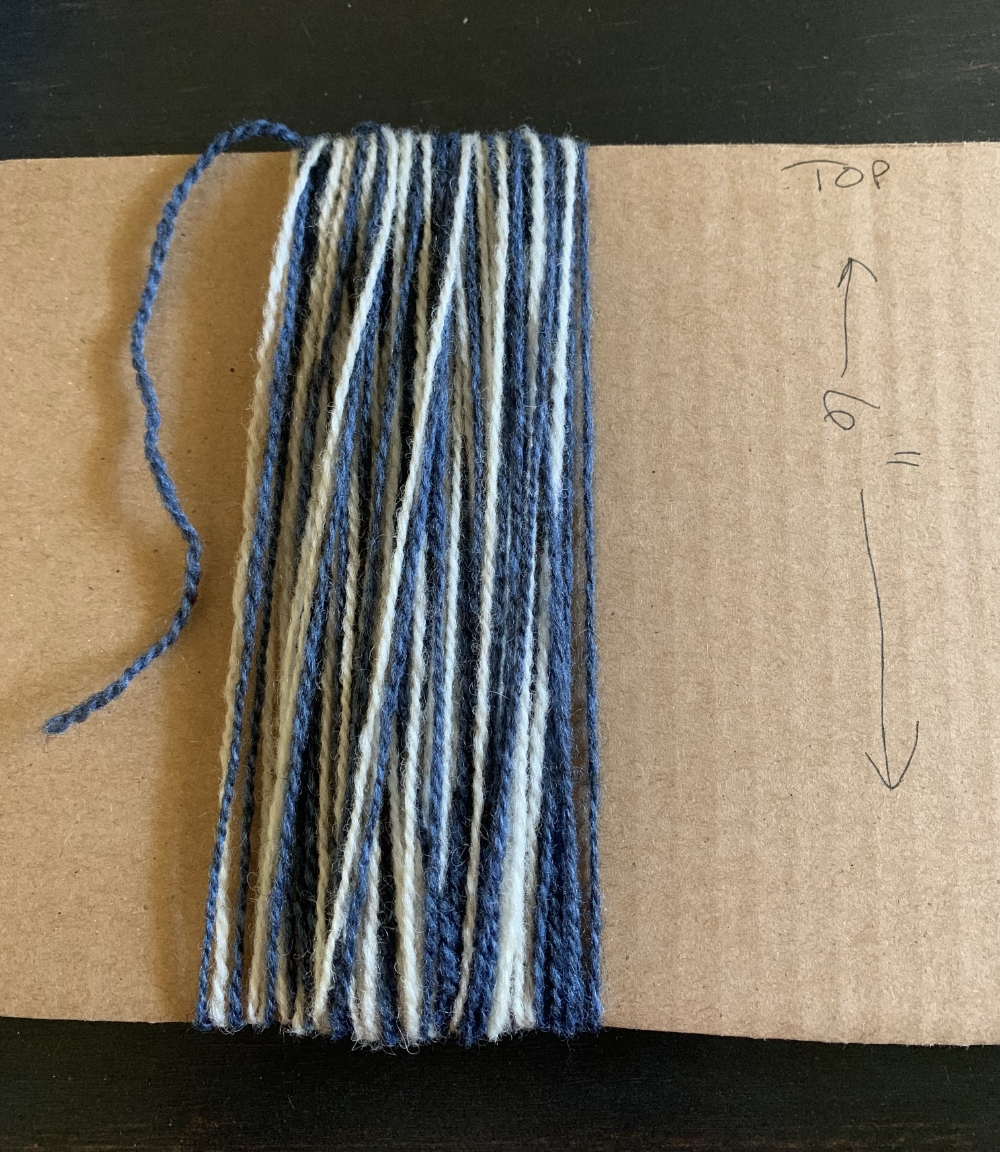 I wrapped both yarn colors 60 times around a six inch cardboard. I tied two strands of yarn around the top and then braided the 4 strands. I wish I’d used more strands for this.