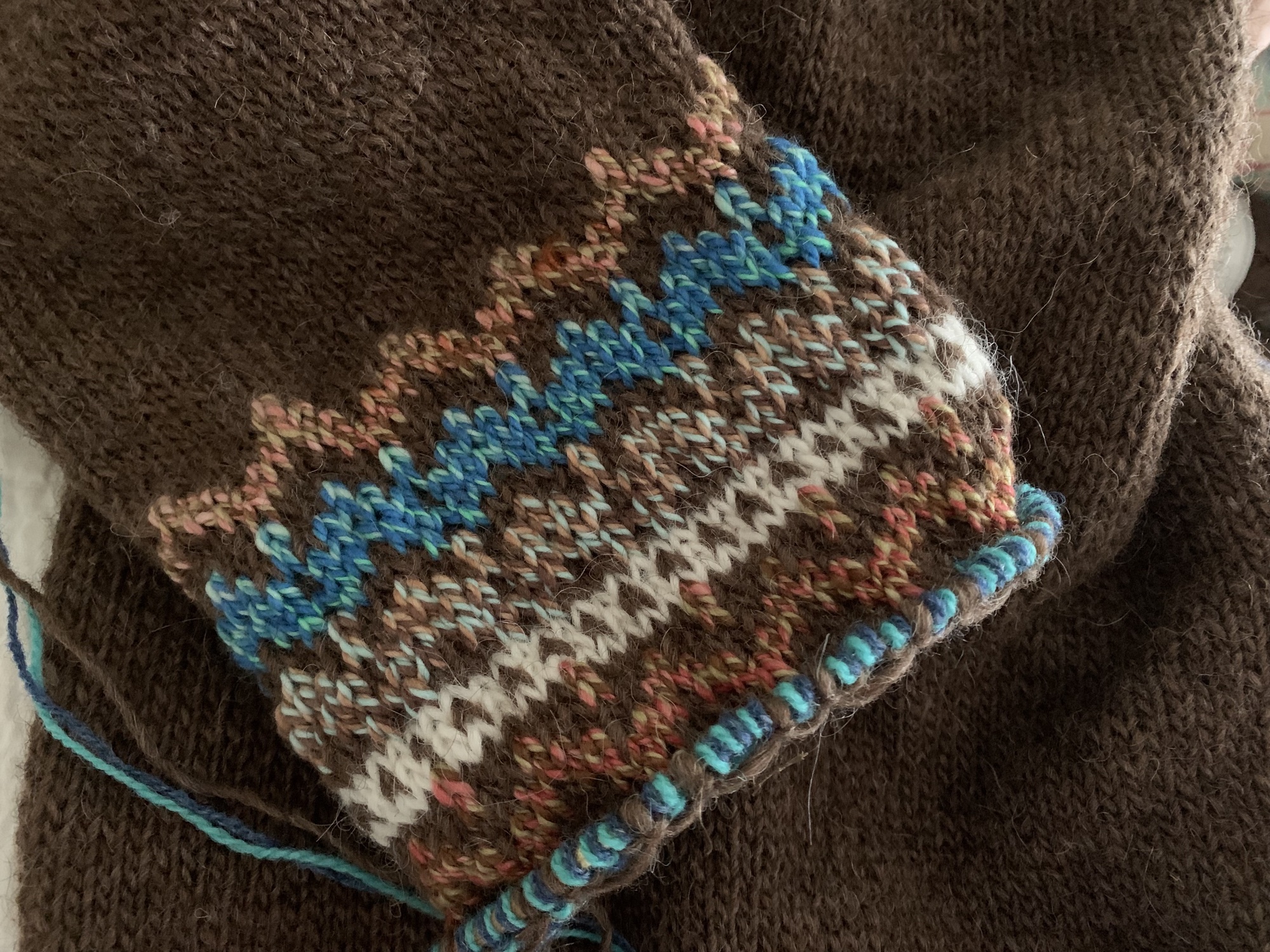 At this point, finishing this sweater is a bit of a chore. I’m ready to move on. My yarn selections were bad (except for the brown Lettlopi), with that colored yarn being very bulky. I wish I had not followed the yoke colorwork and left some brown showing.