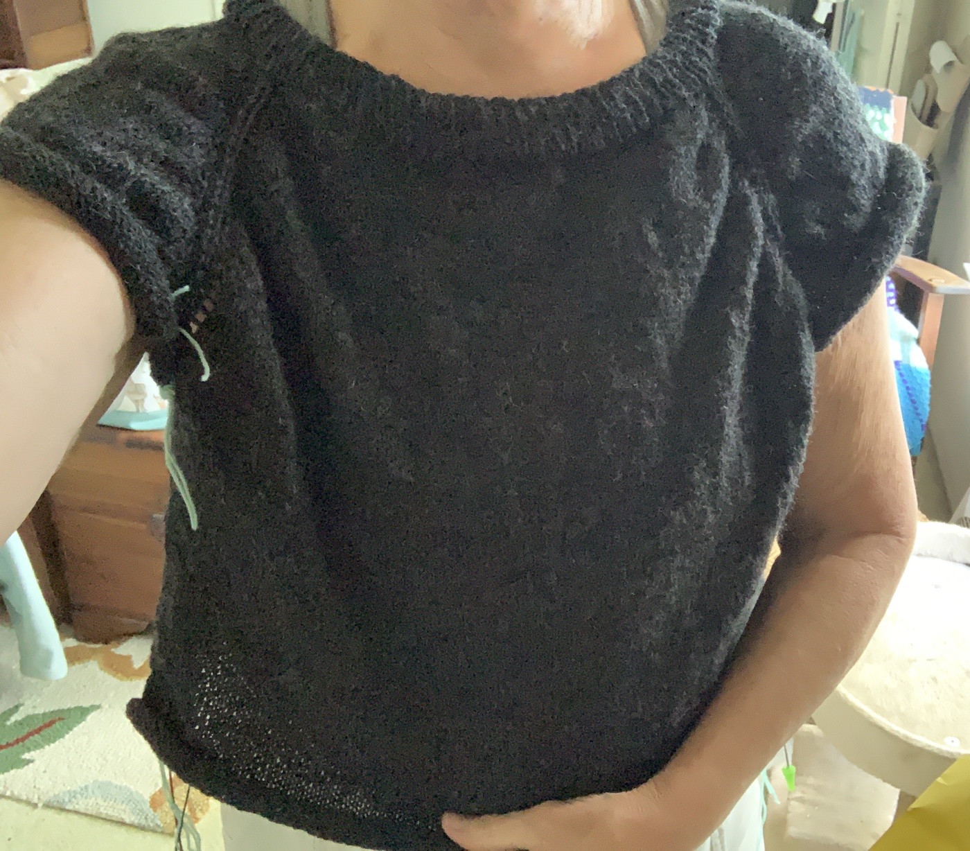 I’ve separated the sleeve, and there are big cast ons for under the sleeves. Now the knitting is round and round for the body.