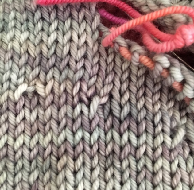 Because my yarn is wool, I am doing a spit-splice every time I change colors or add a new skein of yarn. This is saving me from having to weave in many ends when the garment is finished.