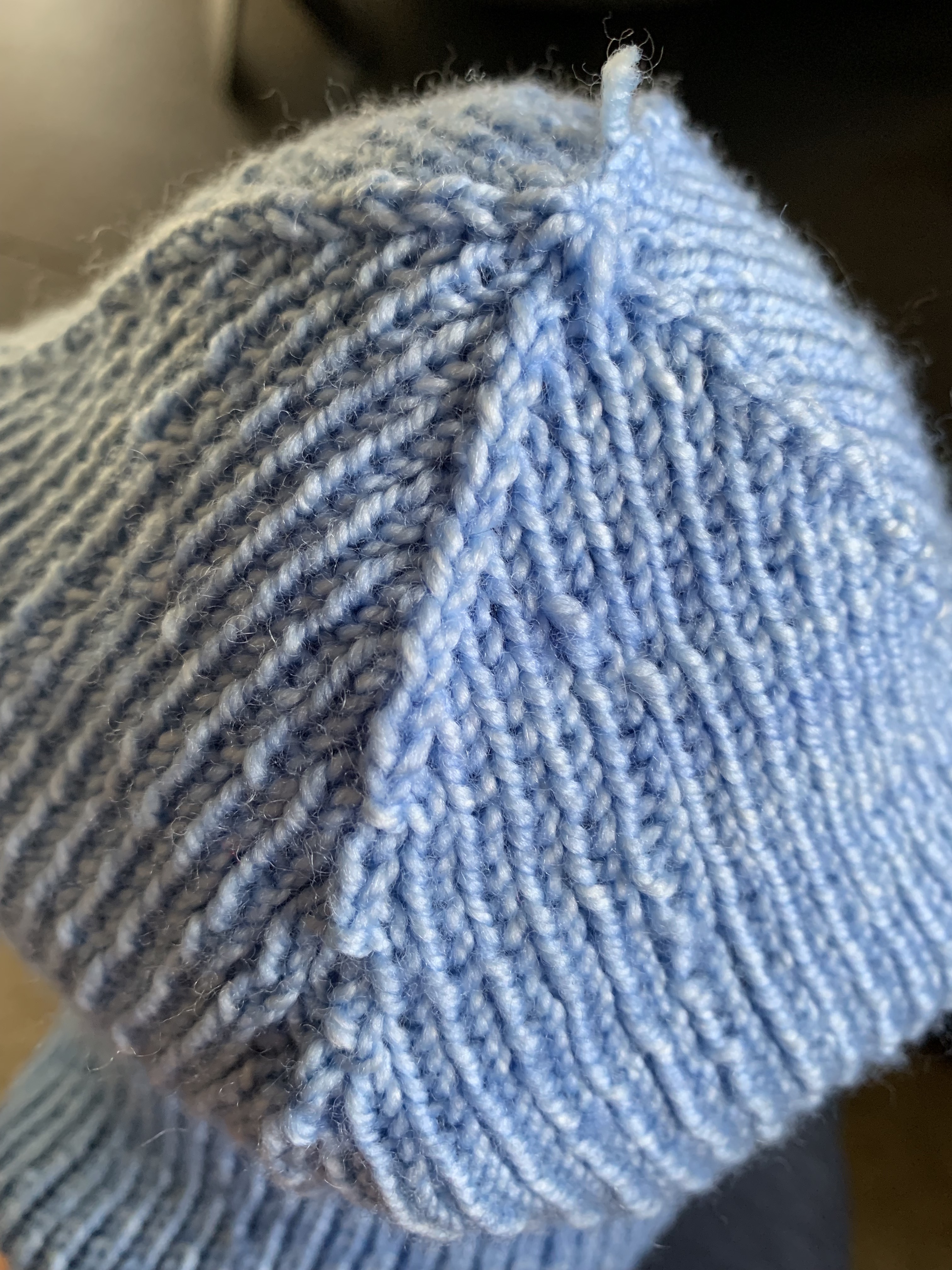 For the blue watchcap – or slouchy hat as I call it – I used the needles suggested, with cast-on number and length as pattern called for. I did not do the pattern’s cast-on, but used the Old Norwegian cast-on.