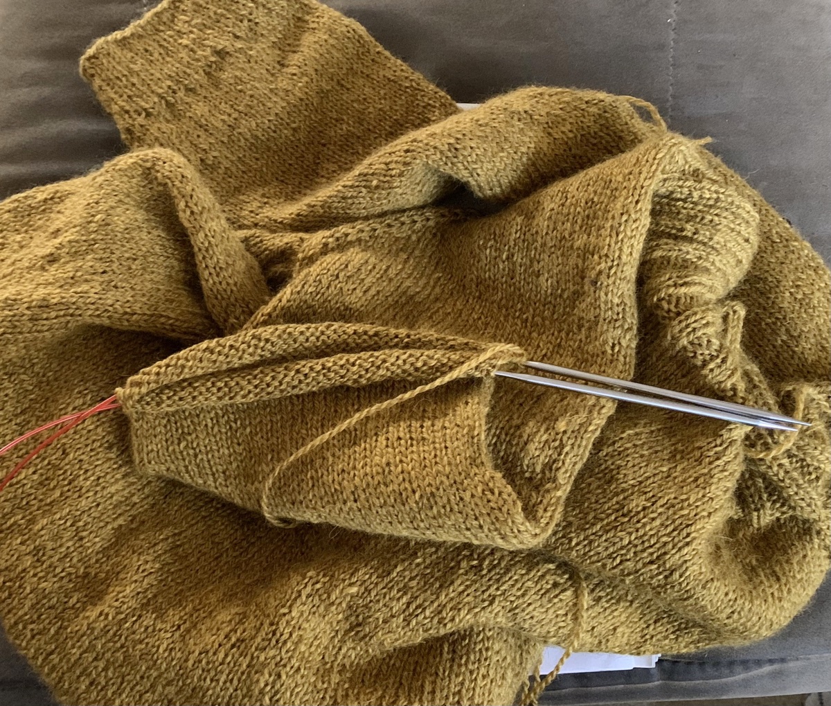 Pull some of the cable from about halfway around. Now you have split the knitting into 2 sections. They don’t have to be exact for most items. Knit one side following your pattern (mine for this sweater is simply knitting around). When you reach the pulled out cord, figure the needles to continue knitting around as usual. It means pulling one needle out – the one where the yarn is hanging. Then, use that needle to continue knitting. Mark the beginning of round so you don’t get confused.