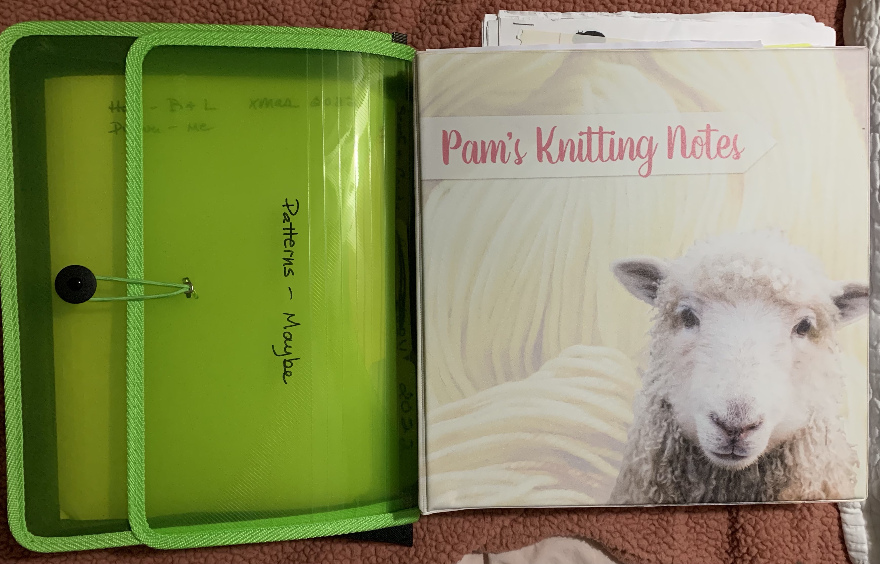 My sheep binder (Zazzle affiliate link) is something I created and put up for sale in my Zazzle shop. The wording on the front is customizable. Then I bought plastic expandable folders (this is an Amazon affiliate link) to fit inside where I slid my printed patterns. They were filling up and expanding to the point of overflowing.
