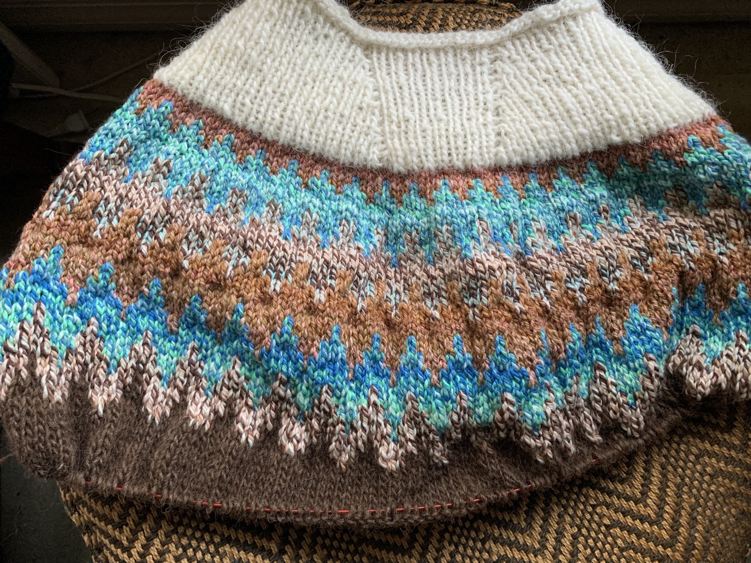 The item is meant to keep your bottom warm while taking a sitting break in winter. The SkiBUM Felted Seating Pad comes with a color-work graph. I began by following it, then changed to more simple designs. I do a lot of knitting while riding in the truck. The bumpy ride makes it difficult to follow a chart.
