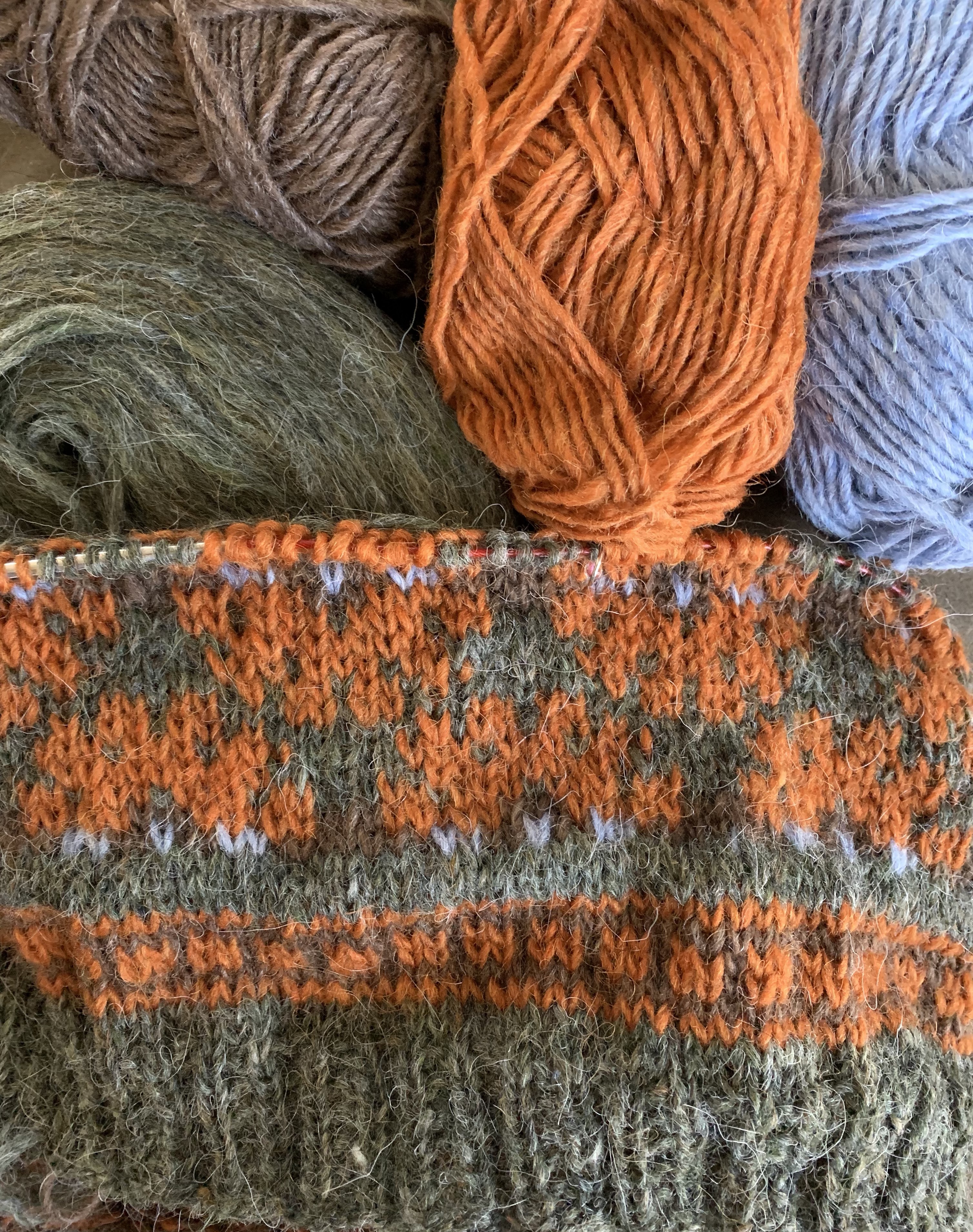 Because I have a lot of Plotulopi in “Frost Grass” green, that is my main color. The main contrast color is Apricot Lettlopi with a bit of Acorn brown and Air Blue Lettlopi in the center of the flower motif.