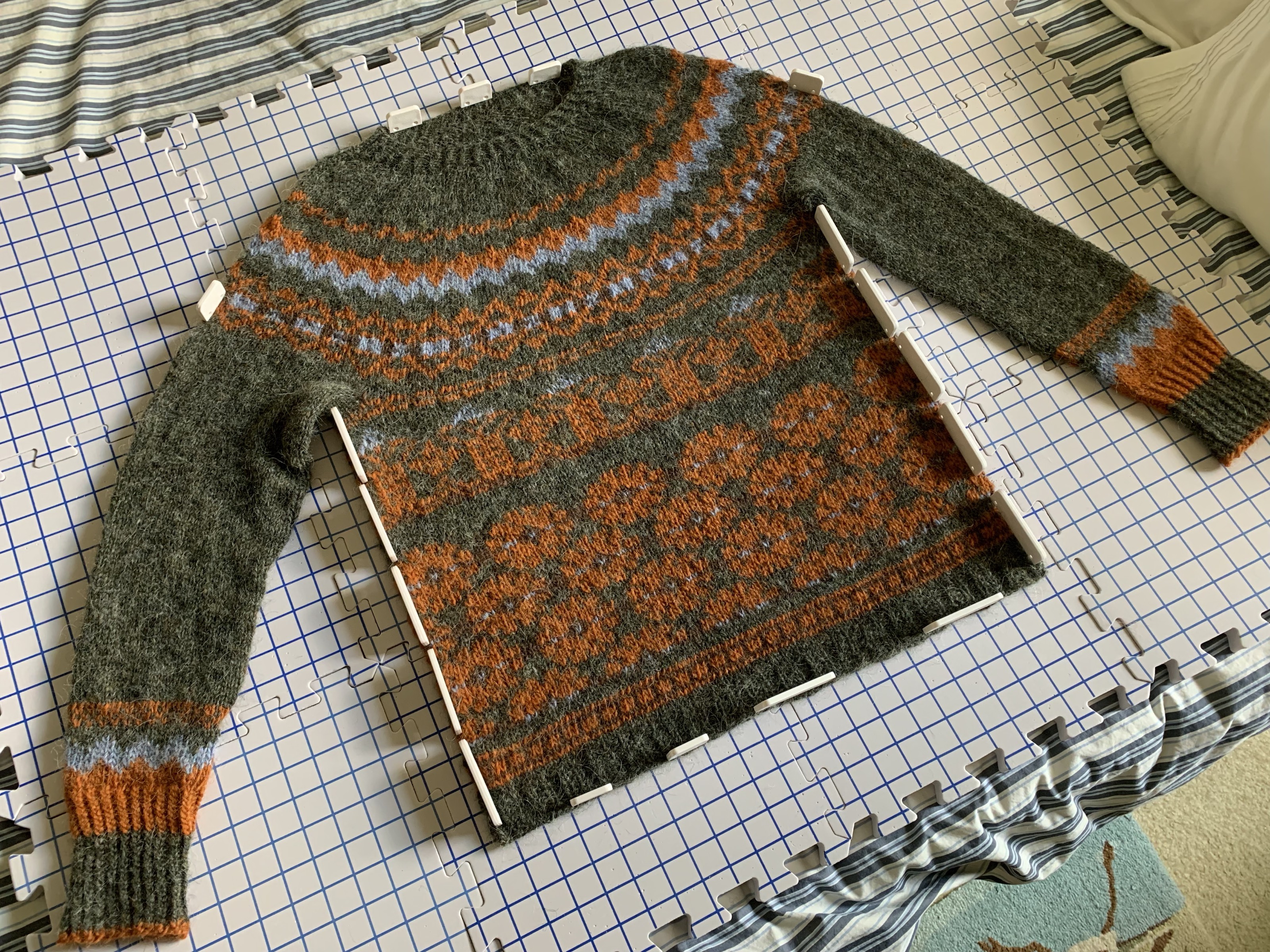 The neck is a simple k1tbl, p – around for about an inch. Then, I was finally able to try it on. The sweater is tight around the body due to all that colorwork. I have the underarm grafting to do and some ends to weave in. Once it’s washed and blocked, I will see how it fits.
