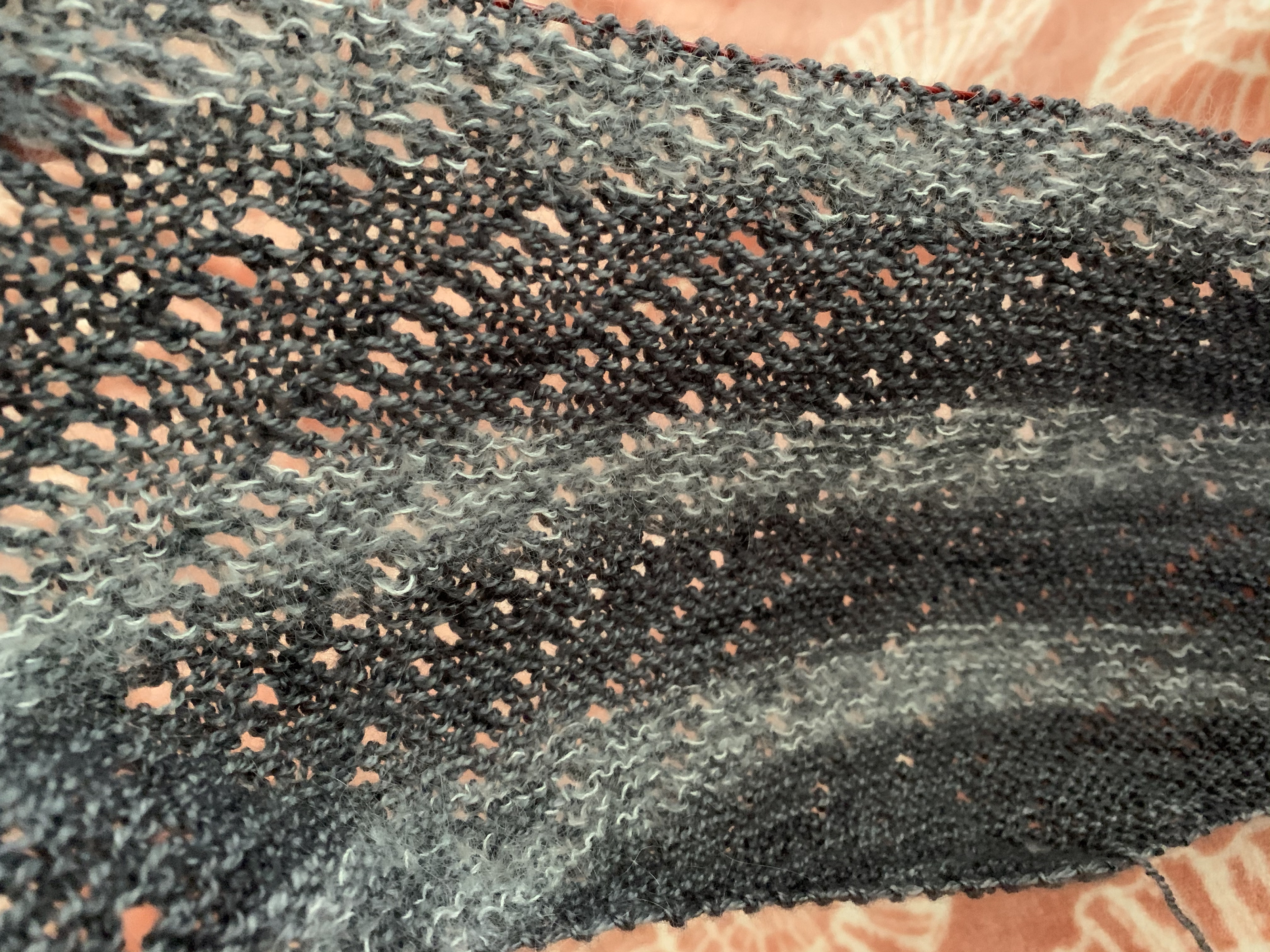 Because I live in the sub-tropics, I never wear any type of shawl. They can be fun to knit though. My favorite shape is the crescent. A crescent shawl can also be called a “half moon” or “half pi” or “pi shawl”.