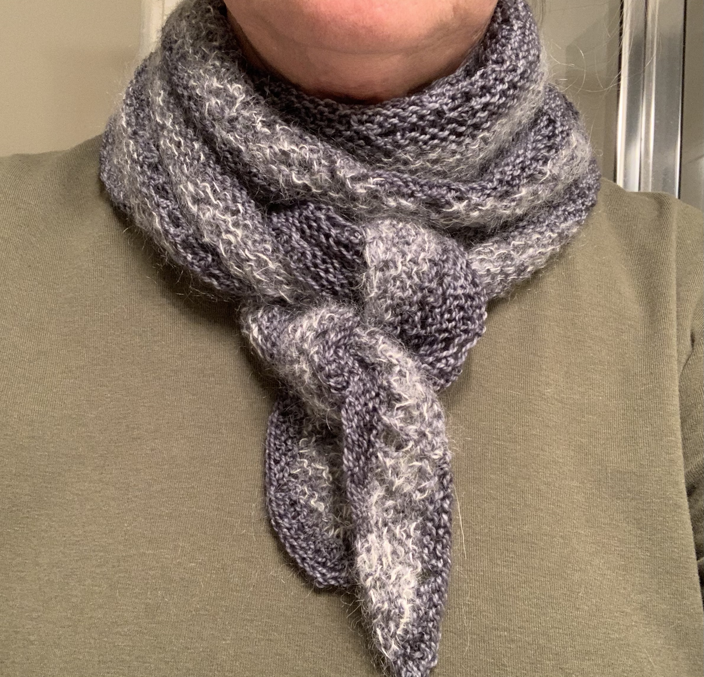 All, except for Spindrift, are angular. When I was ready to take a trip to New Hampshire, I wanted a little wrap for my neck, and knitted the Railings pattern by Janina Kallio. It was a little crescent-shaped shawl and I added some mohair. Using mohair was a mistake, because the fuzz near my face was not good. But, I did wear it during my trip and it provided nice warmth, as intended. It’s a sweet little shawl pattern.