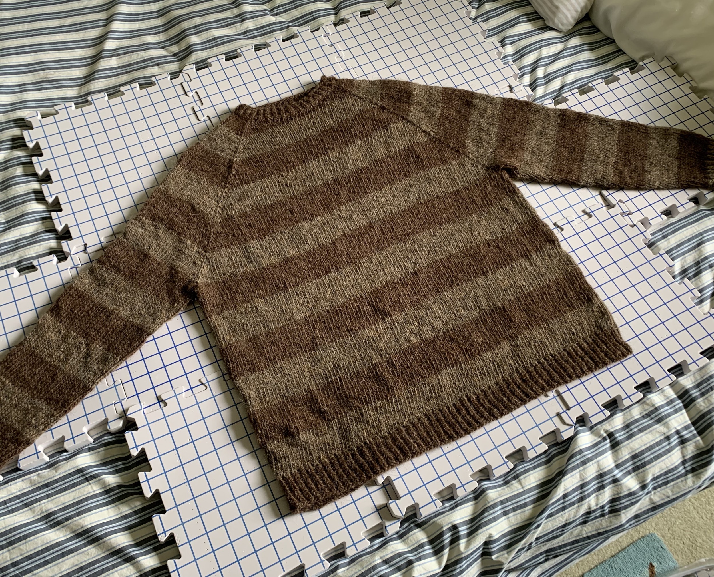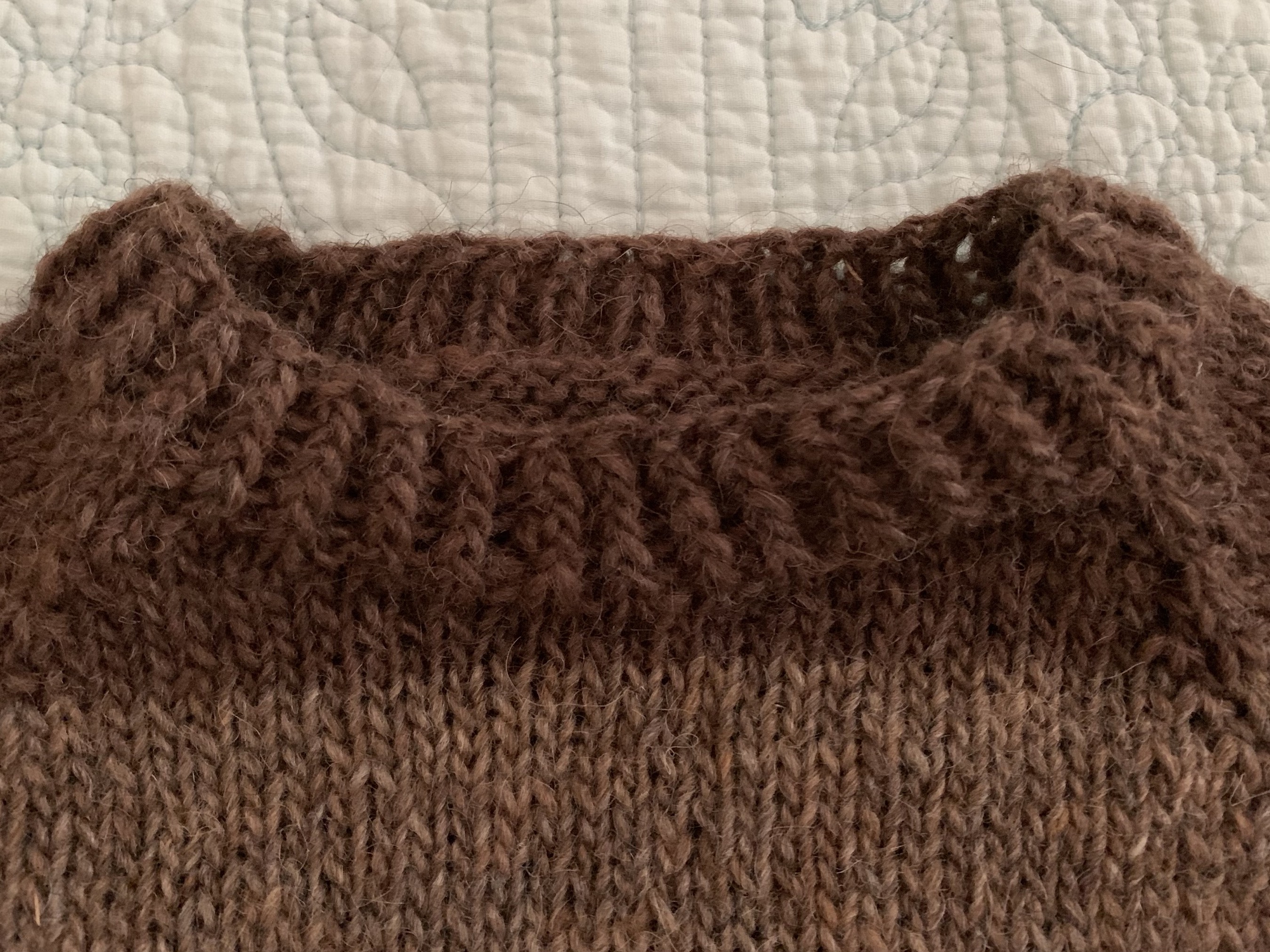 You can see how the dark brown block of color is not as deep at the front as it is on the sleeves and the back. This happened because of the short rows. The front neckline sits nice and low compared to the back.