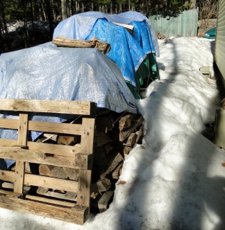 I’ve changed some things to make burning firewood easier this year. Last year my wood was stacked and covered with blue, plastic tarps. I had to trudge through the snow to the stacks of snow covered wood, brush it off and dig it out, then haul it in through the back sliding door to the living room.